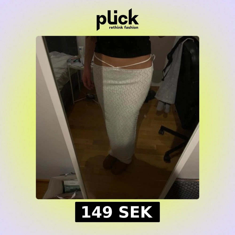 Snygg vit långkjol med ett diskret mönstwr/virkad och knytband i midjan. Kjolen har en tight passform och är perfekt för sommaren❣️