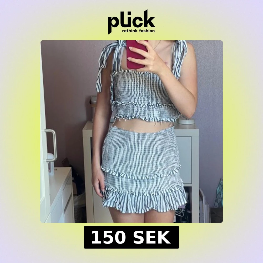 Superfin kort kjol och topp med blå och vita ränder och volangdetaljer, klippt av mig.