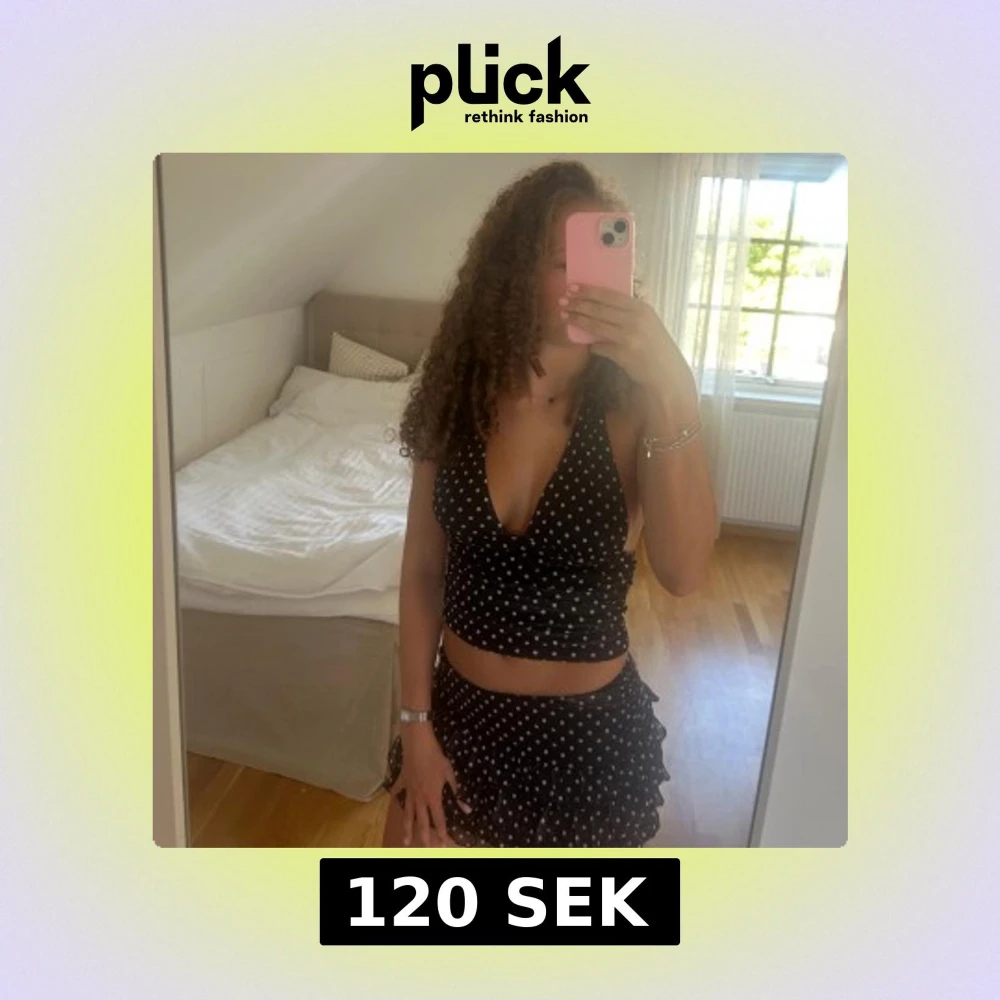 Säljer ett snyggt prickigt set som passar perfekt till fina tillfällen. Kjolen har inbyggda shorts som gör den mycket bekväm. Toppen är en halterneck med öppen rygg.