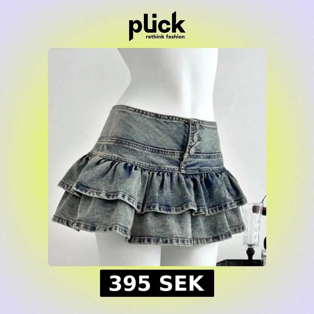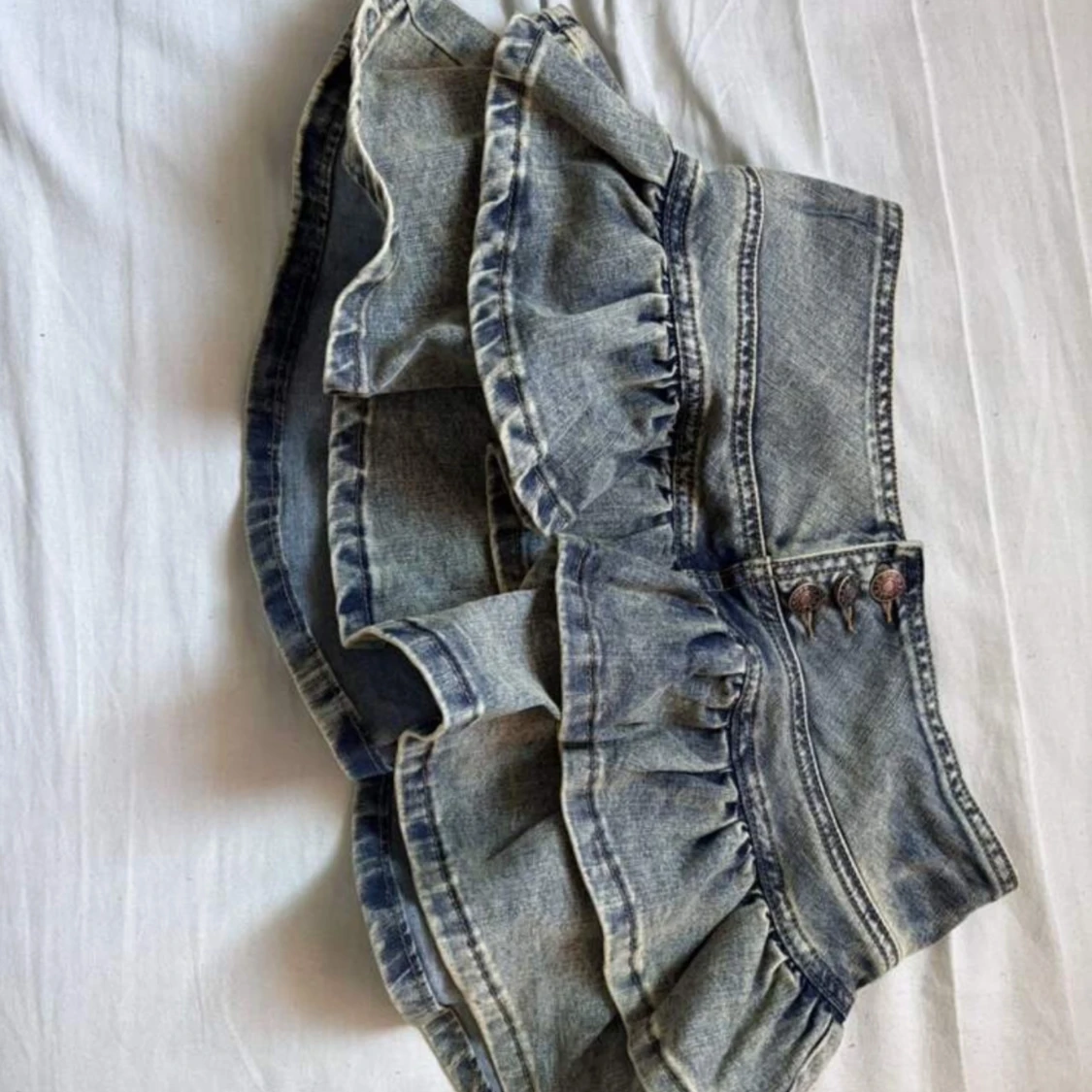 Supersöt kort jeanskjol i blå denim med dubbla volanger och dekorativa knappar framtill. Kjolen har markerad midja och cool tvättad look som ger en trendig vibe. Perfekt för dig som vill sticka ut med en edgy och lekfull stil❤️❤️.