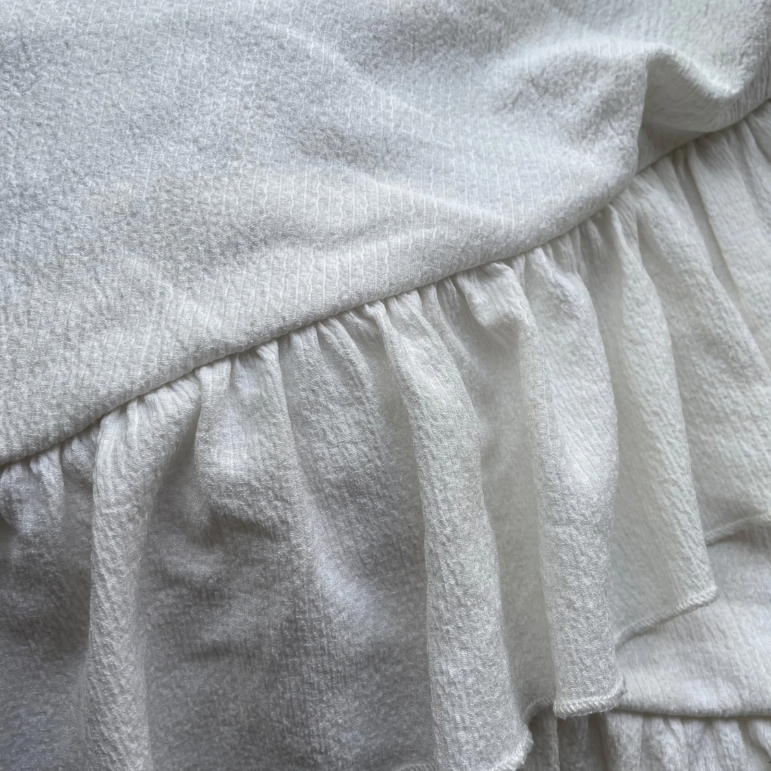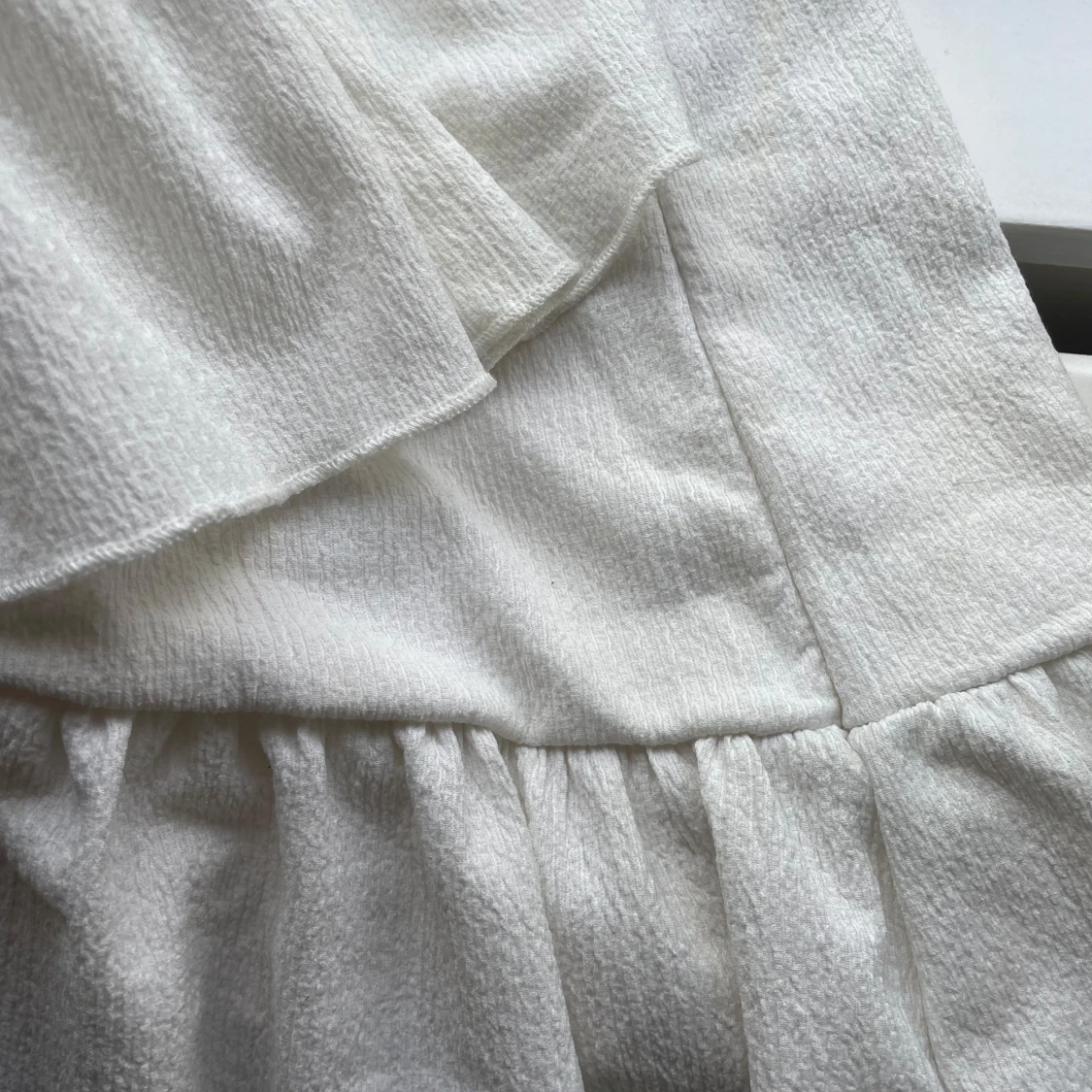 Supersöt vit kortkjol från NLY Trend i storlek S. Kjolen har volanger och en lätt skrynklig struktur som ger en chill och trendig vibe. Perfekt för varma dagar och snygg att styla med crop tops eller oversized t-shirts.