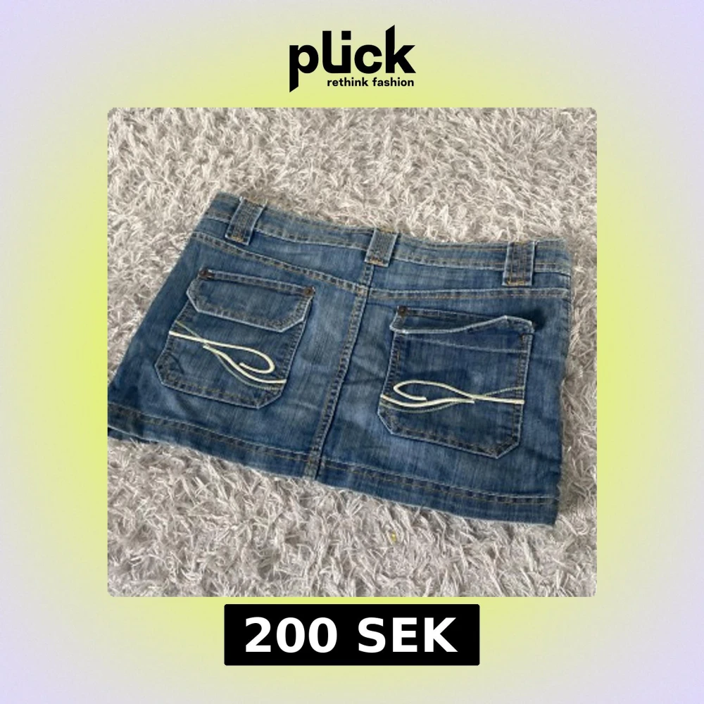 Säljer en klassisk blå jeanskjol med broderade detaljer på bakfickorna. Kjolen har bälteshällor, knapp och dragkedja framtill samt två fickor fram och två bak. Perfekt för dig som gillar denim och vill ha en enkel men snygg kjol i garderoben.