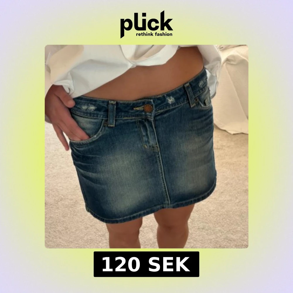 Säljer en klassisk mörkblå jeanskjol med fem fickor och bälteshällor. Kjolen har en kort passform och stängs med knapp och dragkedja framtill. Perfekt för dig som gillar en enkel och tidlös stil.