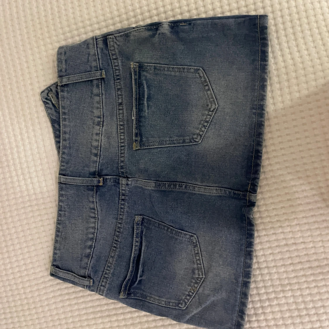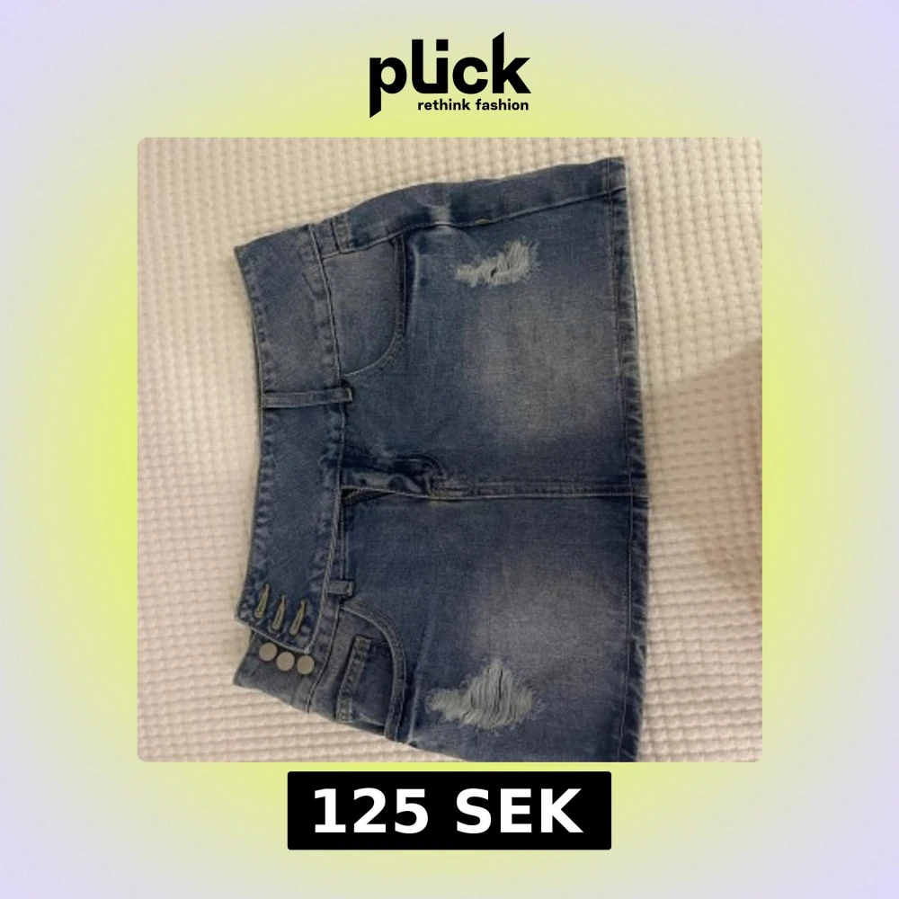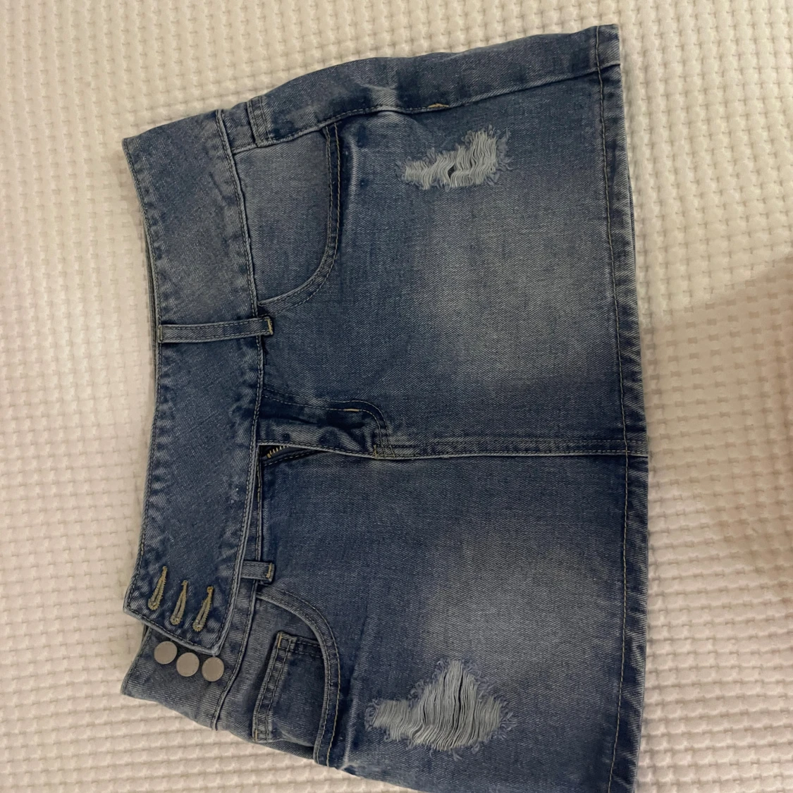 Säljer en snygg blå jeanskjol med slitna detaljer och klassiska fickor både fram och bak. Kjolen har tre silverfärgade knappar i sidan och bälteshällor. Perfekt för dig som gillar en avslappnad och trendig stil. Från shein, köpta för: 250kr?