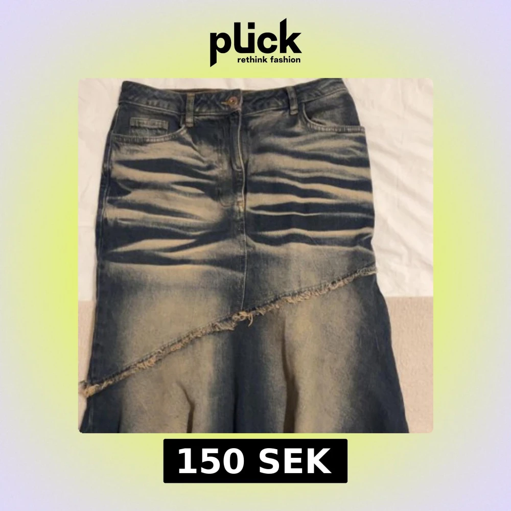 Snygg jeanskjol med unik fransdetalj och asymmetrisk design. Kjolen har en klassisk jeansfärg och är perfekt för en avslappnad stil. Den har fickor både fram och bak samt en rå kant som ger en cool touch. Köpta från beyond retro skriv vid intresse för bättre bilder!