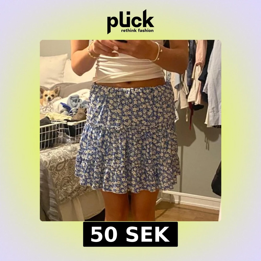 Supersöt kort kjol med blå botten och vita blommor. Kjolen har volanger och resår i midjan för en bekväm passform.
