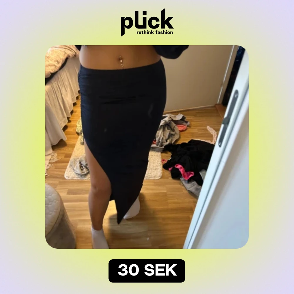 Säljer en superfin svart asymmetrisk kjol med en cool slits på sidan. Kjolen är perfekt för fest och har en tight passform som framhäver figuren. Den är gjord i ett mjukt och stretchigt material som gör den bekväm att bära hela kvällen. Passar perfekt till både vardag och fest! 🖤