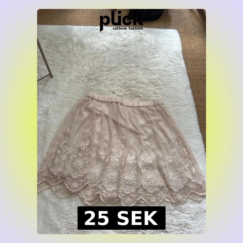 Söt beige kortkjol med vacker spets och broderade blommönster. Kjolen har elastisk midja och är super skön, från h&m (divided) i storlek 36 (s)