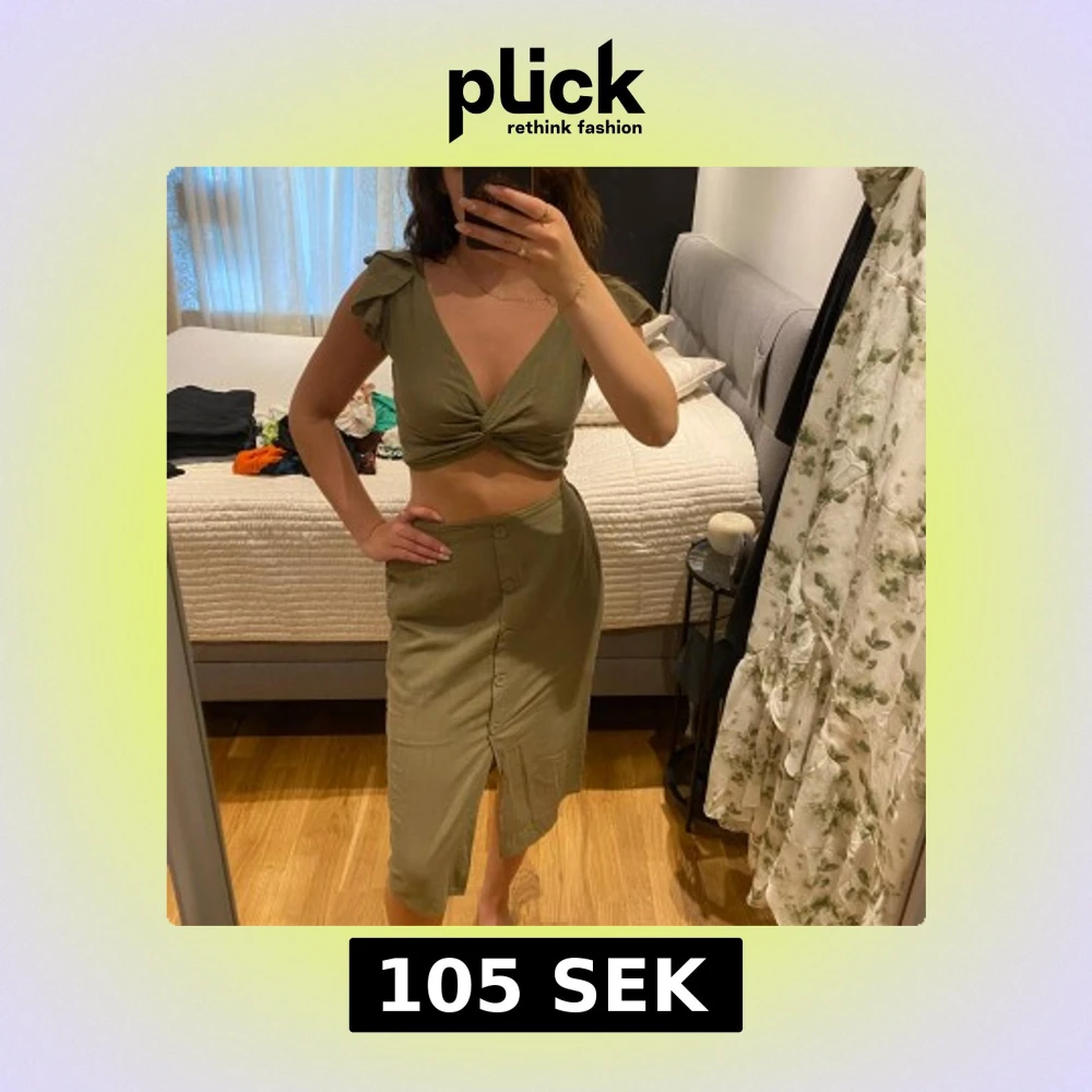 Snygg olivgrön croppad topp med v-ringning, twistad detalj framtill och volangärmar. Toppen är ärmlös och gjord i ett lätt linnematerial, perfekt för varma dagar. Tillkommer en matchande kjol i samma material.