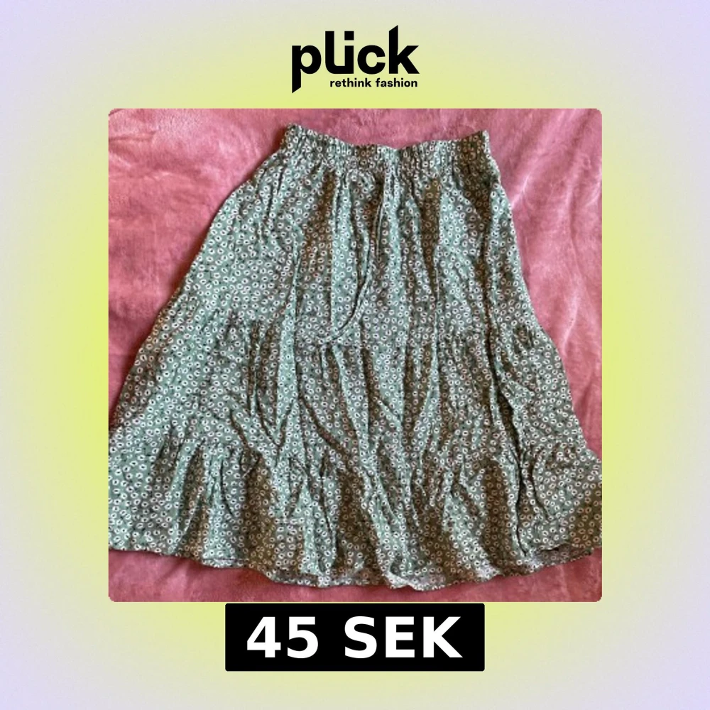Supersöt grön kjol med blommor!! Den går ungefär ner till knäna så den är medium length. Passar utmärkt till en härlig sommardag 😎resåren i midjan är relativt stretchig så trots att den är storlek s hade den nog passat m också!!