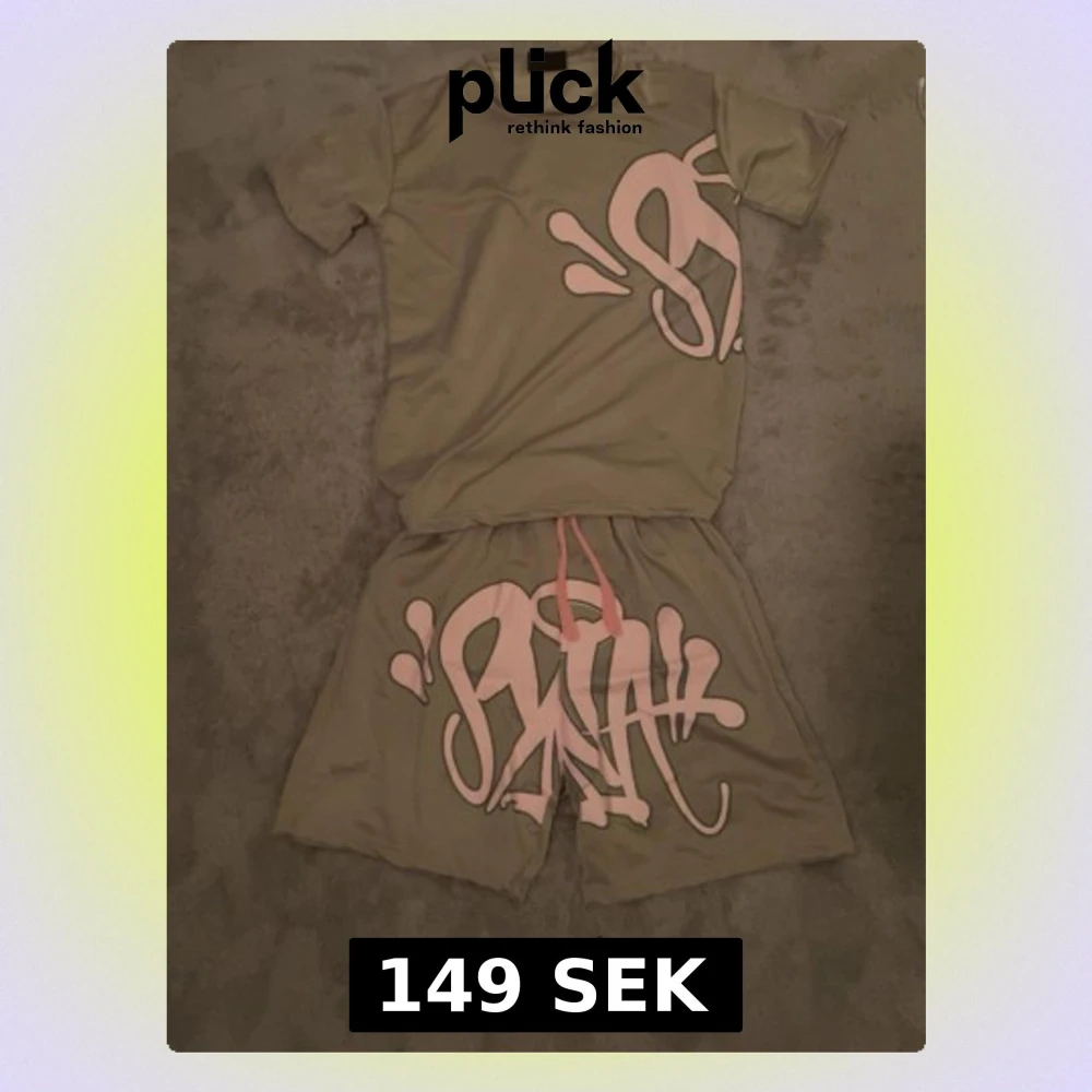 Säljer ett par beige shorts med stort rosa graffiti-tryck framtill. De har en loose passform och snörning i midjan för extra komfort. Materialet känns mjukt och syntetiskt, perfekt för chill dagar. Matcha med t-shirten för en cool streetstyle.