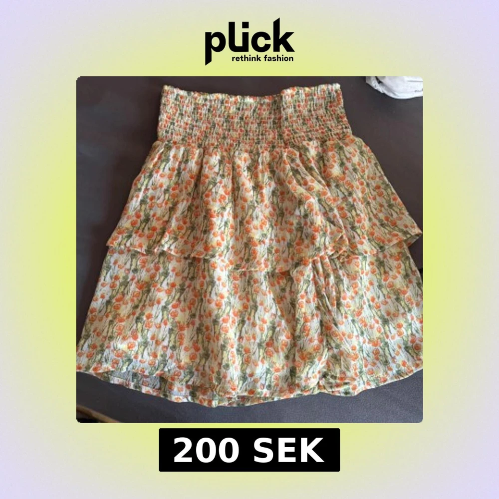 Supersöt kort volangkjol från MSCH med blommigt mönster i orange, grön och gul på vit botten. Kjolen har smock i midjan och flera lager volanger som ger en luftig och somrig känsla. Perfekt för dig som gillar färg och mönster!