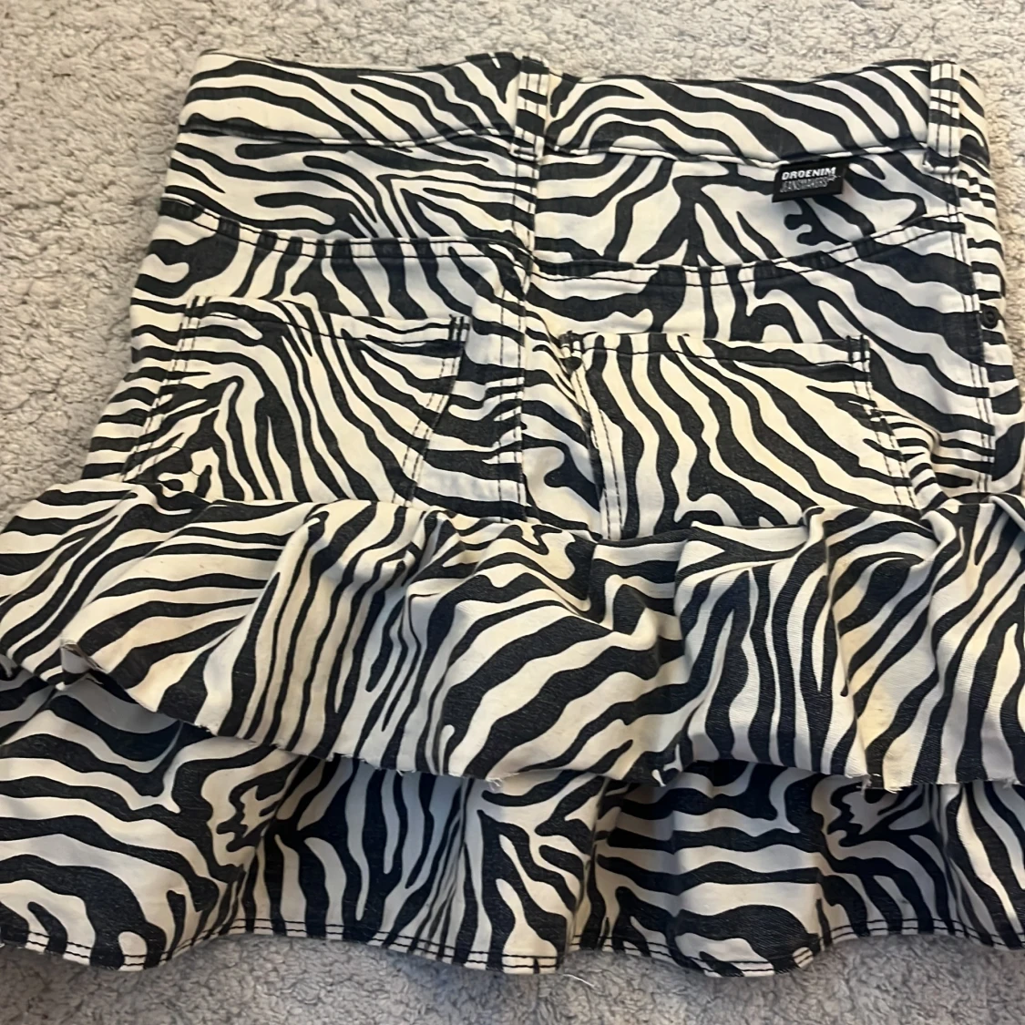 Supersnygg kort kjol från Dr Denim med svartvitt zebramönster och volangkant. Kjolen har klassisk jeanslook med fickor fram och bak samt knapp och dragkedja. Perfekt statement piece för dig som vill sticka ut. Sytt om den själv därav priset, ursprungligen jeans och därav storlek L . Men nu bör den ör kjol sitter den som en S.