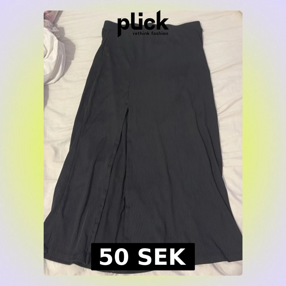 Säljer en svart långkjol med diskret ribbad struktur och slits framtill. Kjolen har en enkel och stilren design som passar till många olika looks. Materialet känns mjukt och följsamt mot kroppen.