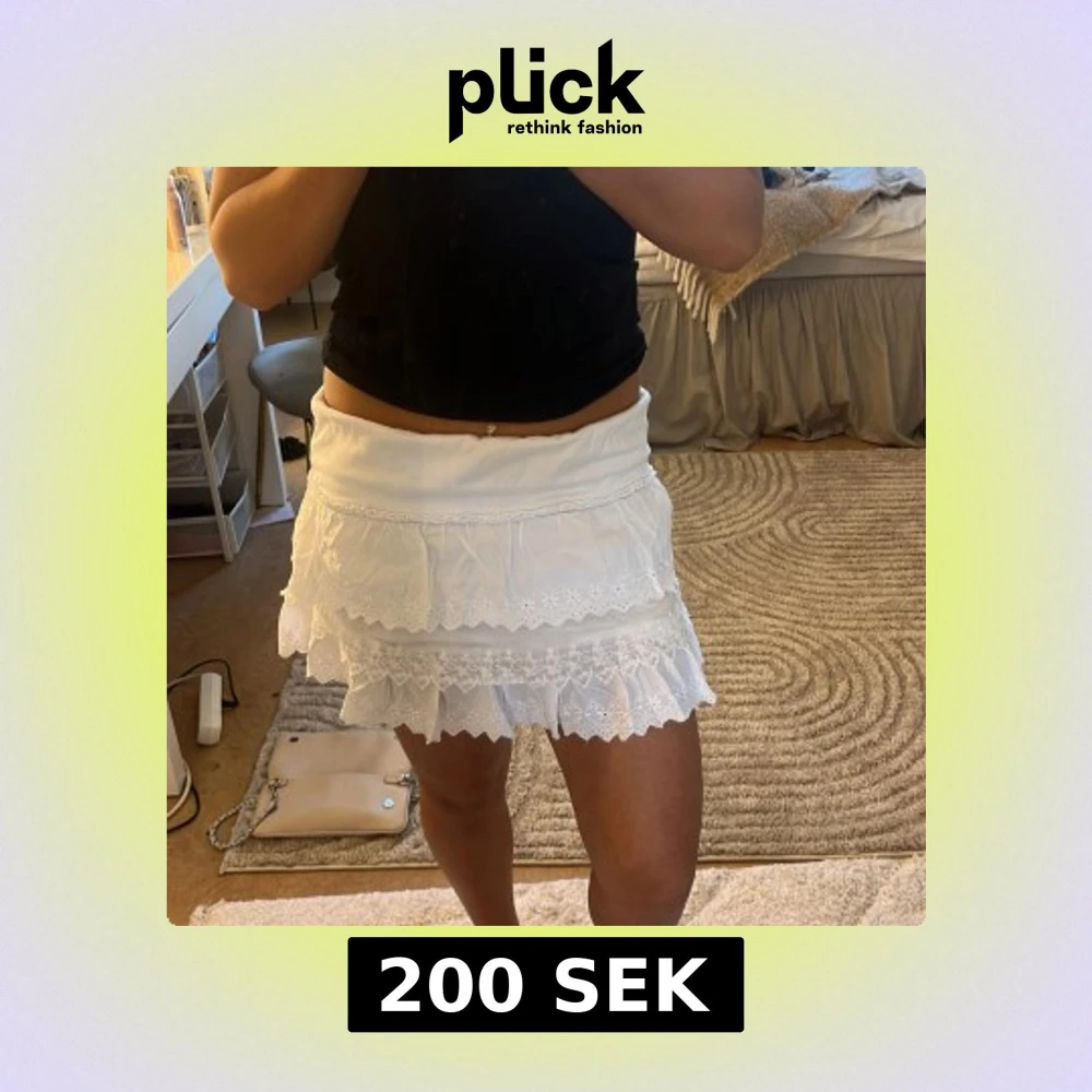 Säljer en söt vit lågmidjad kortkjol med spetsdetaljer. Perfekt för varma sommardagar! Köpte på en Saco hand butik