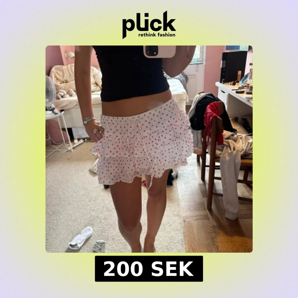 Supersöt kort kjol i vitt med rosa prickar och flera volanger.