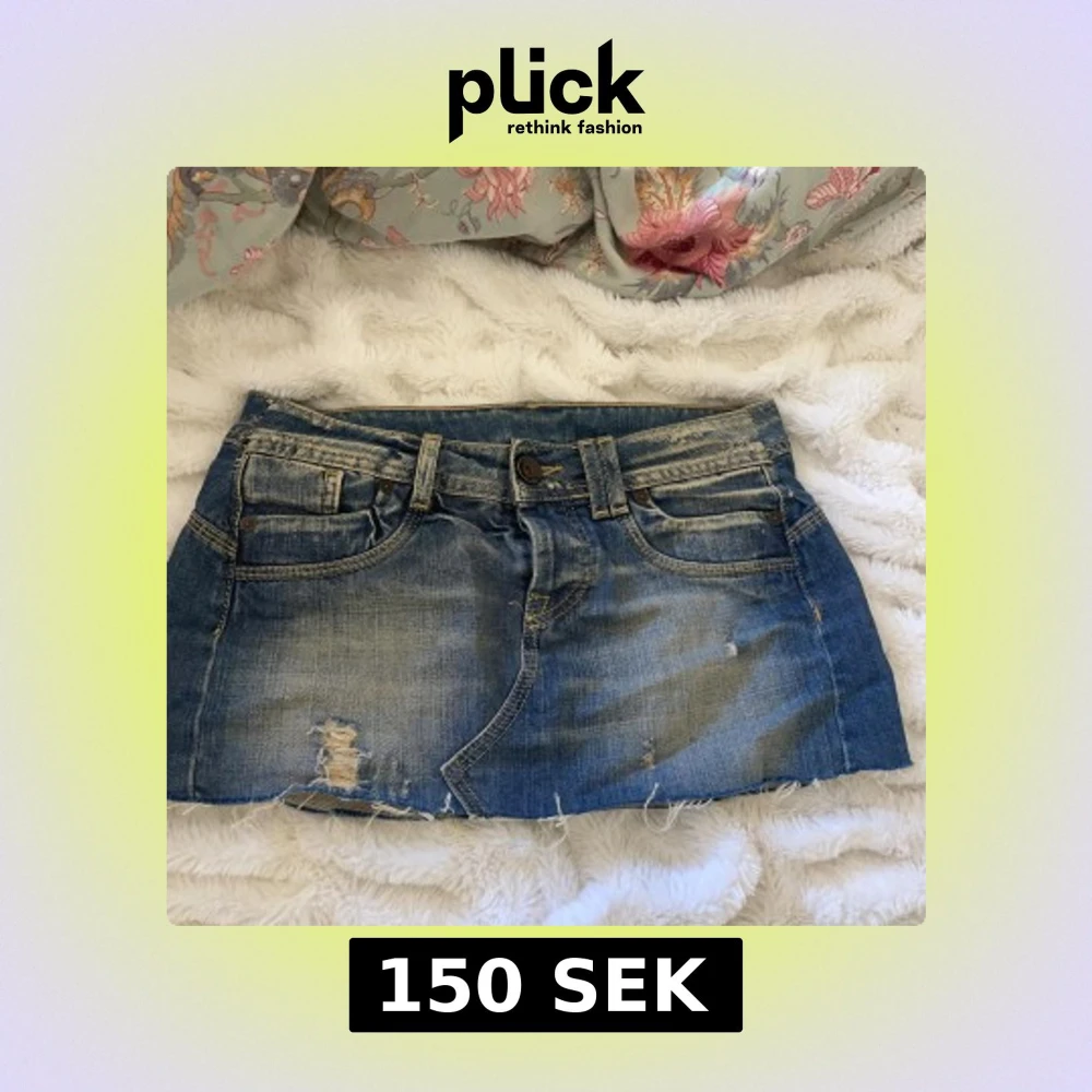 Säljer en blå jeanskjol i kort modell med slitna detaljer och fransig nederkant. Kjolen har klassiska fickor fram och bak, bälteshällor och knäppning framtill. Perfekt för dig som gillar en avslappnad och trendig look.