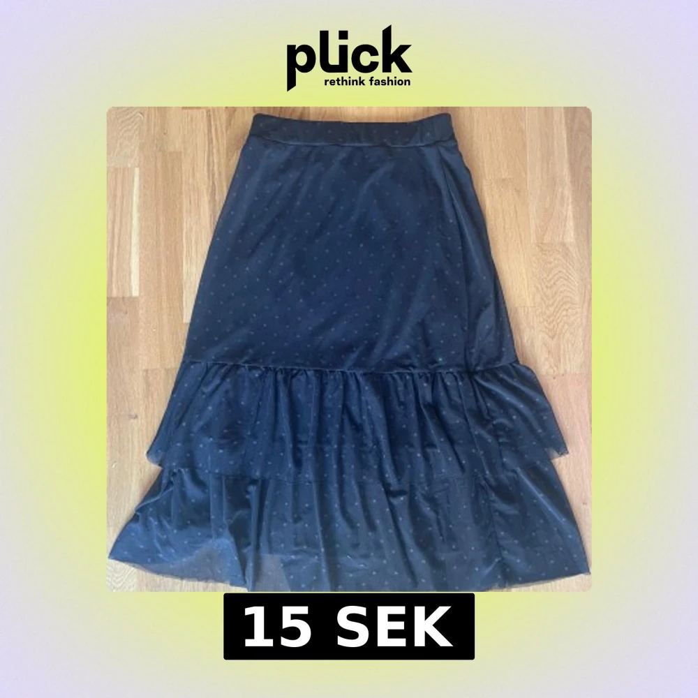 Supersnygg svart långkjol från Even&Odd med diskret prickigt mönster och volang nertill. Kjolen har en flowy passform och är gjord i ett lätt, syntetiskt material som ger en luftig känsla. Perfekt för dig som gillar en stilren men ändå lekfull look. Står ingen storlek men skulle säga s. Använt några gånger. Går att pruta
