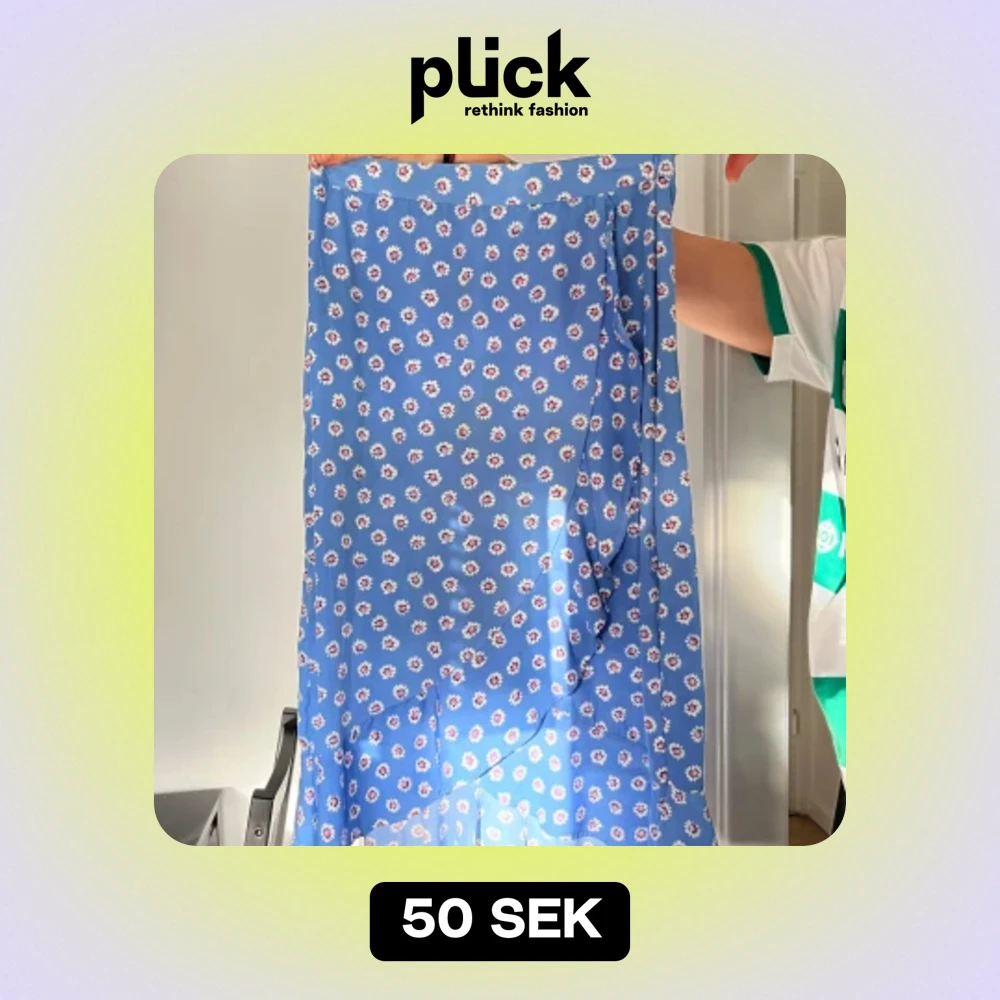 En blå långkjol med ett blommigt mönster. Kjolen har en volangdetalj längst ner och är tillverkad i ett lätt och flödande material.
