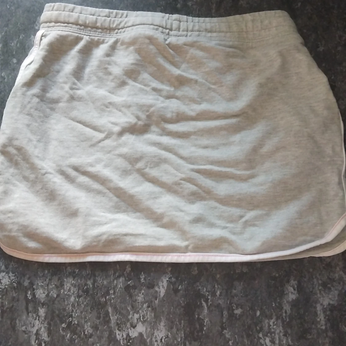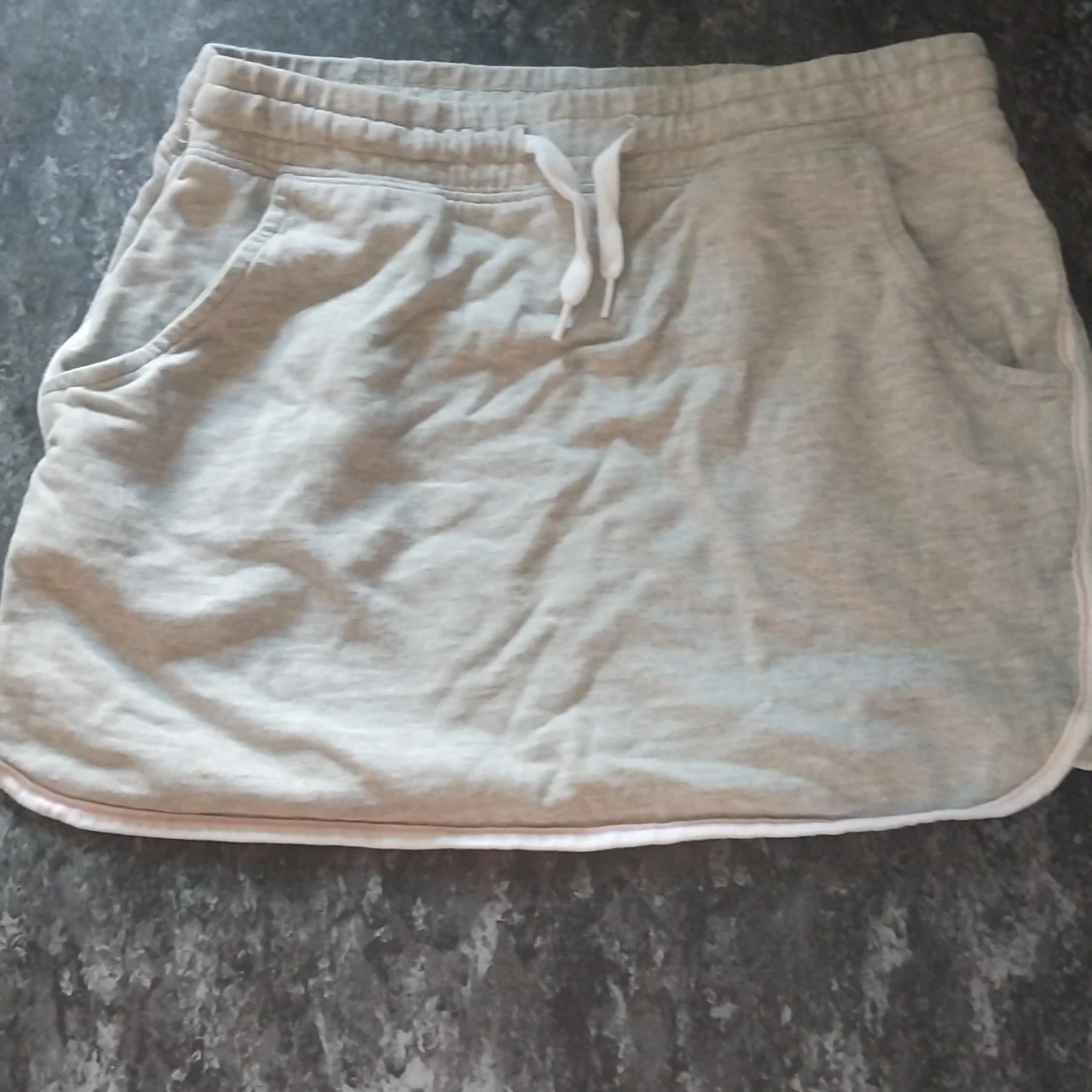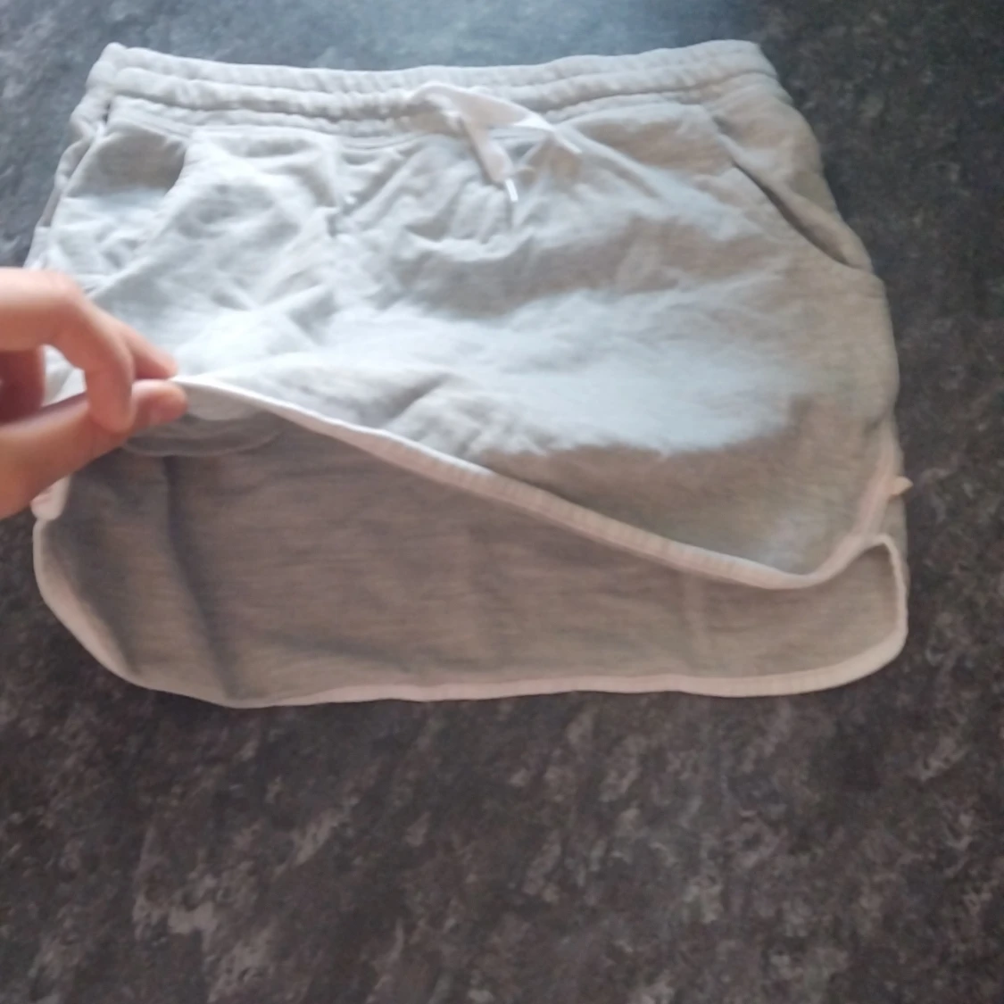 Sportig ljusgrå kortkjol i mjukt bomullsmaterial med vita kanter och snörning i midjan. Kjolen har två praktiska fickor framtill och en avslappnad passform, perfekt för en chill och aktiv stil.