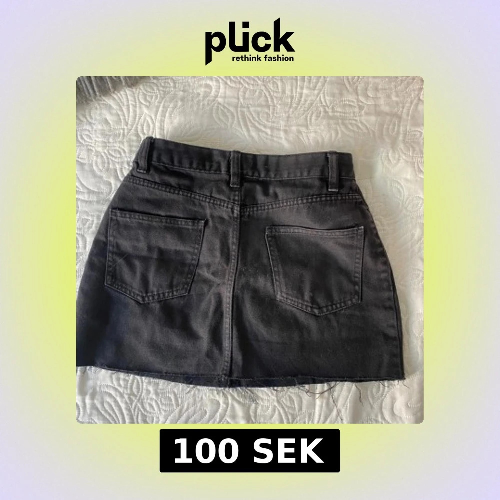Säljer en svart jeanskjol med klassiska fickor fram och bak samt hällor för bälte. Kjolen har en rå, avklippt kant nedtill för en cool look. 💕