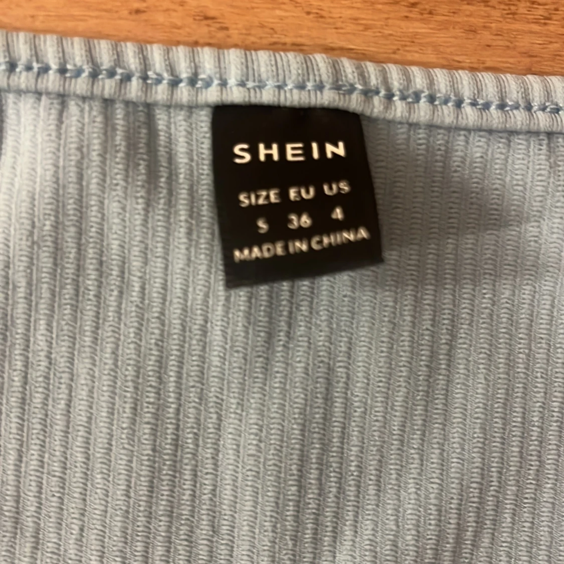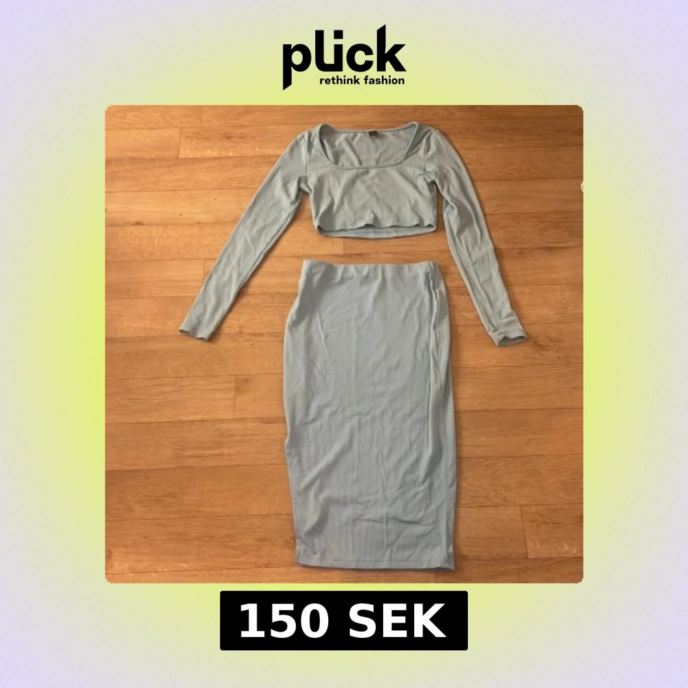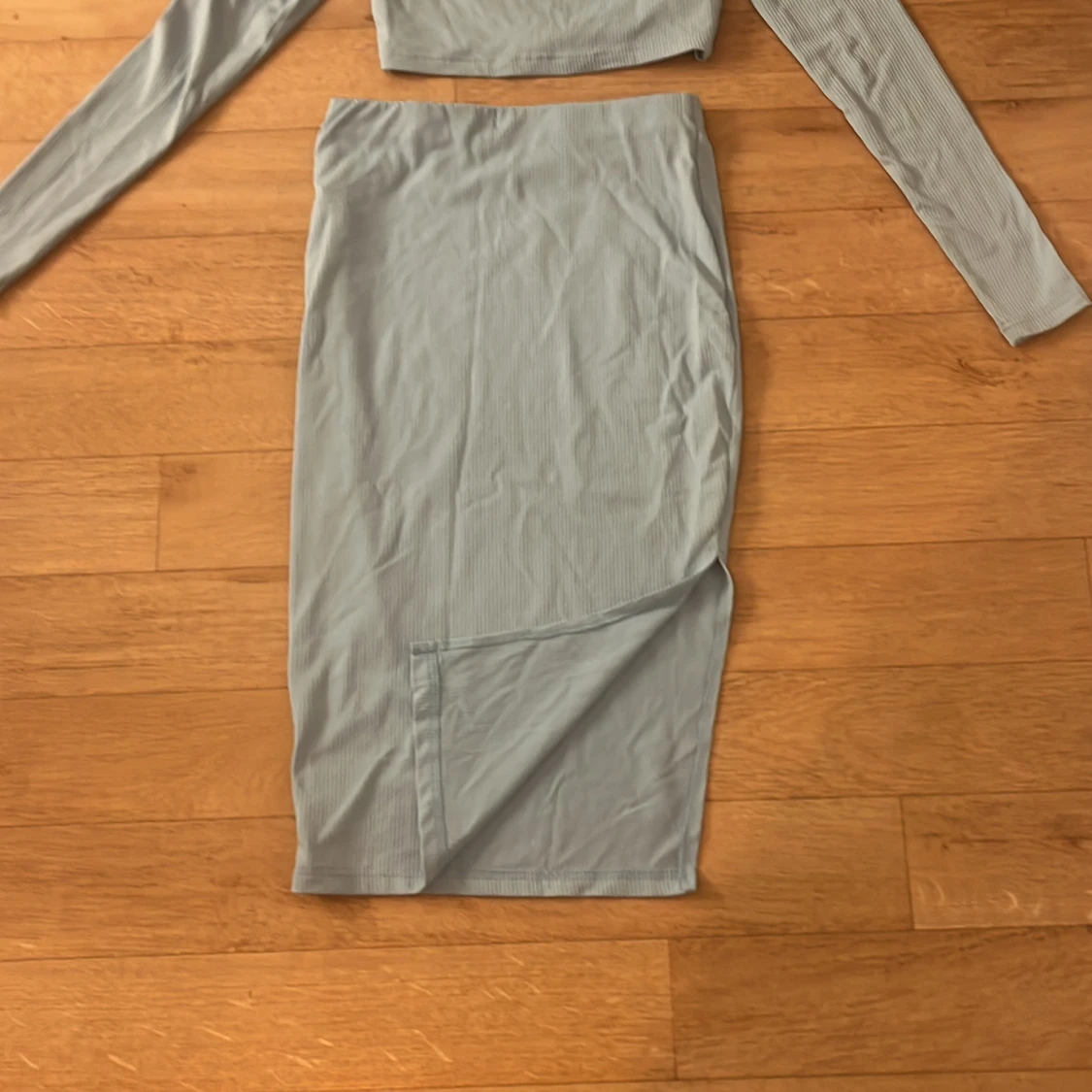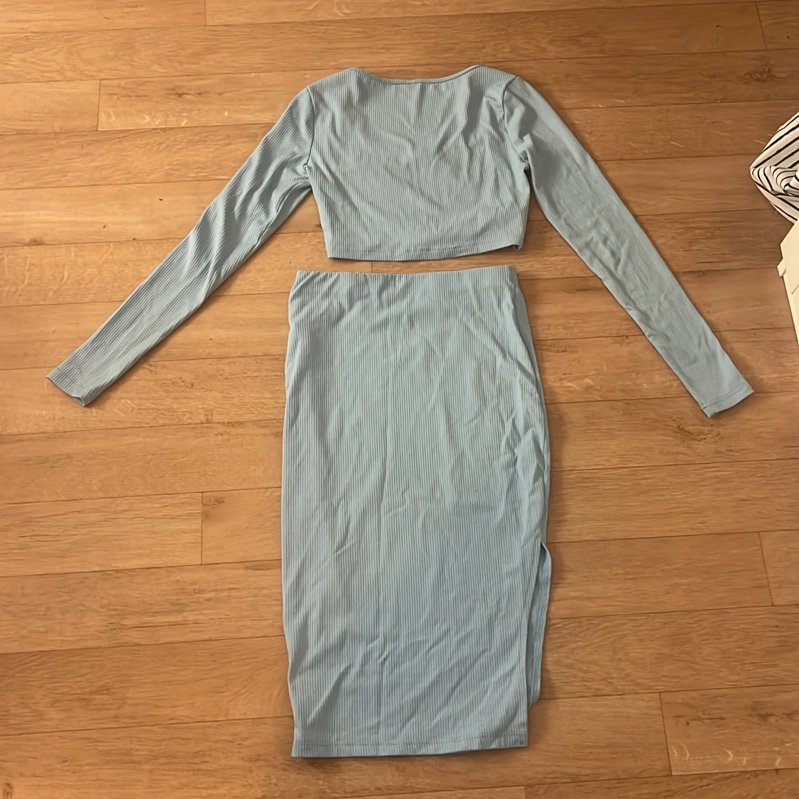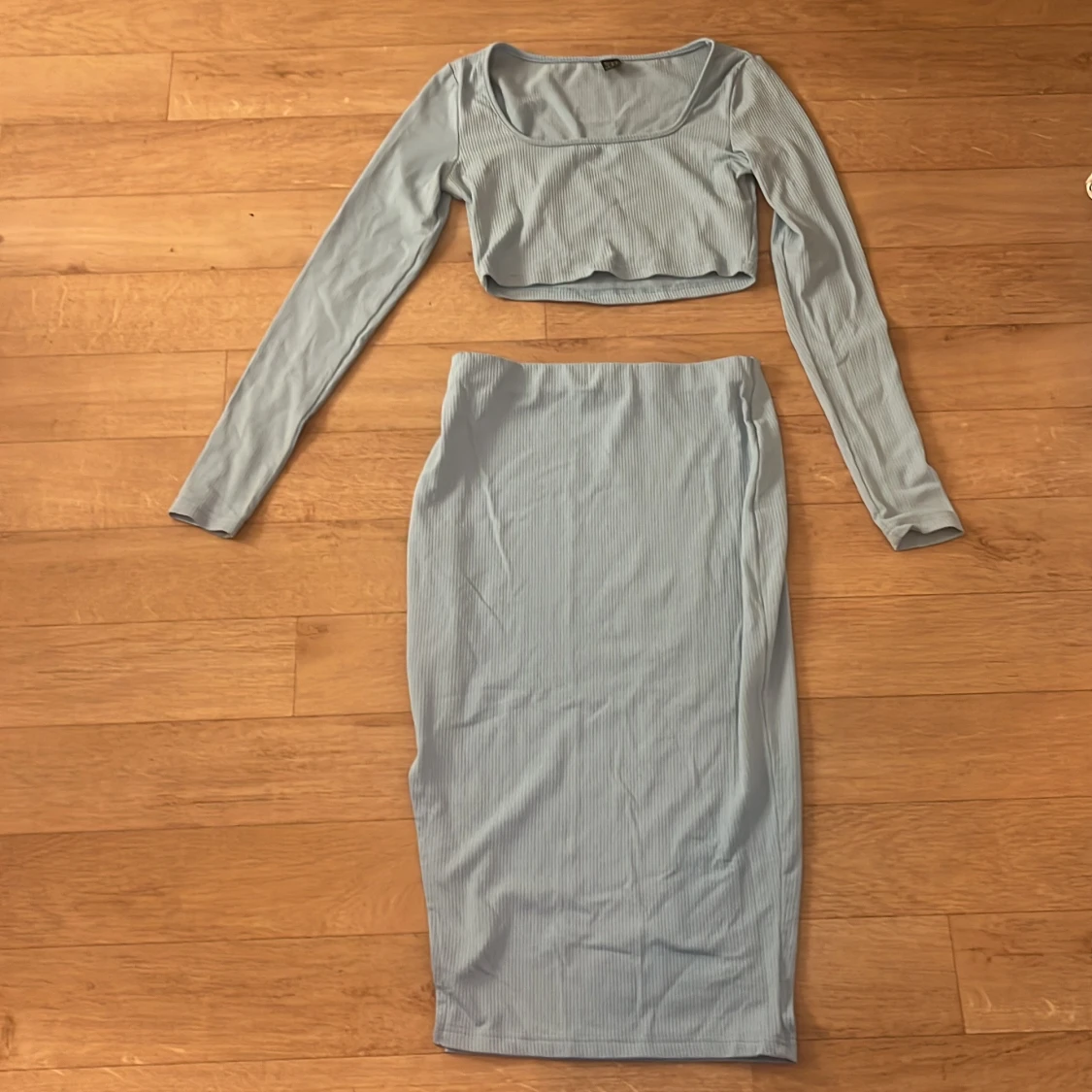 Säljer en ljusblå ribbad medel lång kjol med en cropped topp från SHEIN i storlek S. Kjolen är figurnära och har en enkel, stilren design utan synliga detaljer. Materialet är mjukt och stretchigt, perfekt för en trendig look.