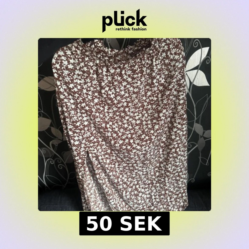 Säljer en brun långkjol med vitt blommönster. Kjolen har en lös passform och är perfekt för varmare dagar. Den är lång och har ett mjukt, följsamt tyg som ger en avslappnad känsla.