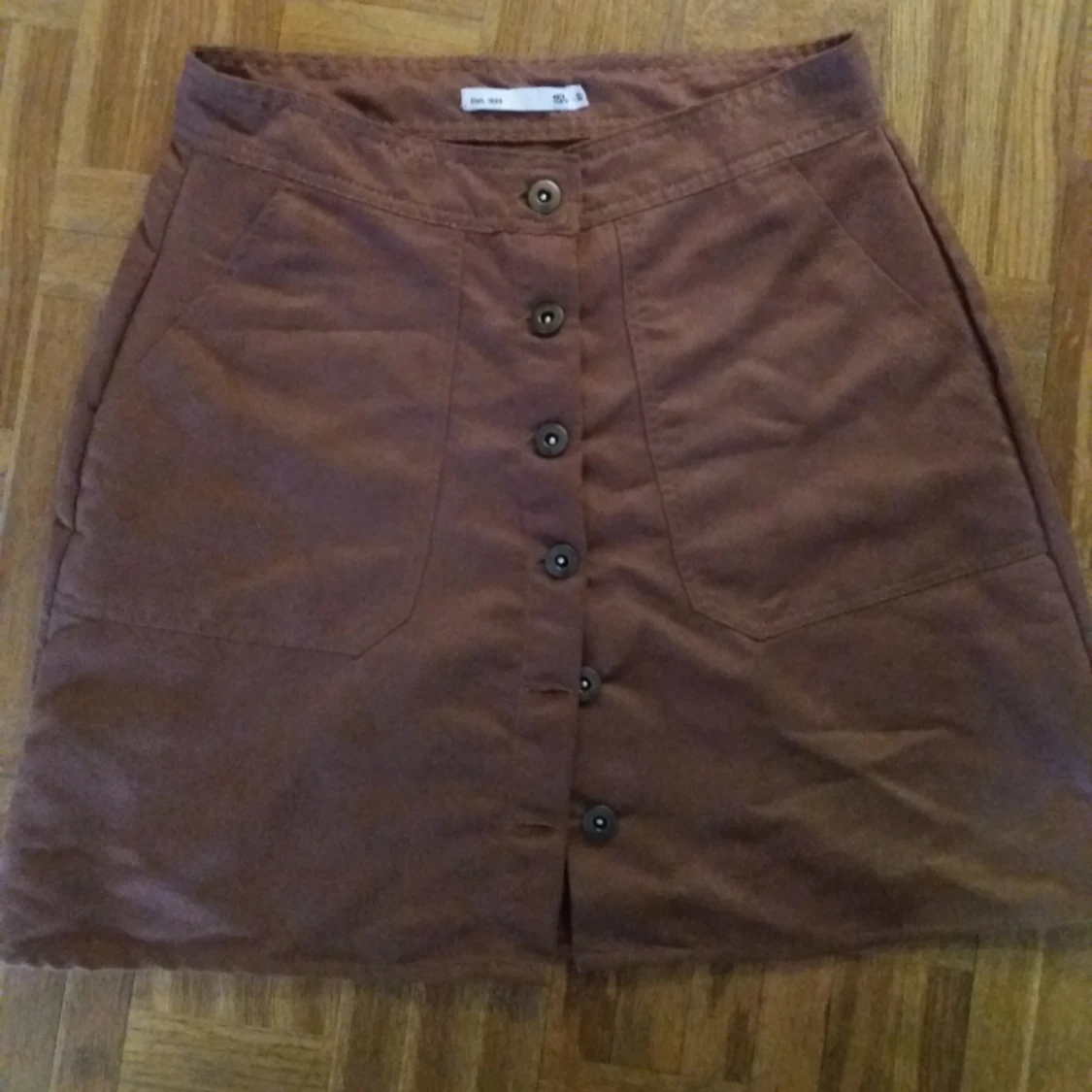 Kjol med knäppning i mocka-imitation. Aldrig använd. Frakt: 36kr.