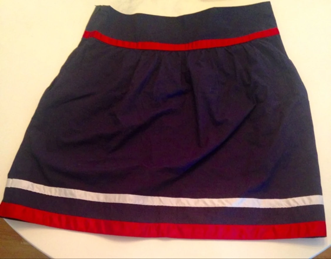Blå kjol med vita och röda ränder. Midjemått 74 cm. Aldrig använd.