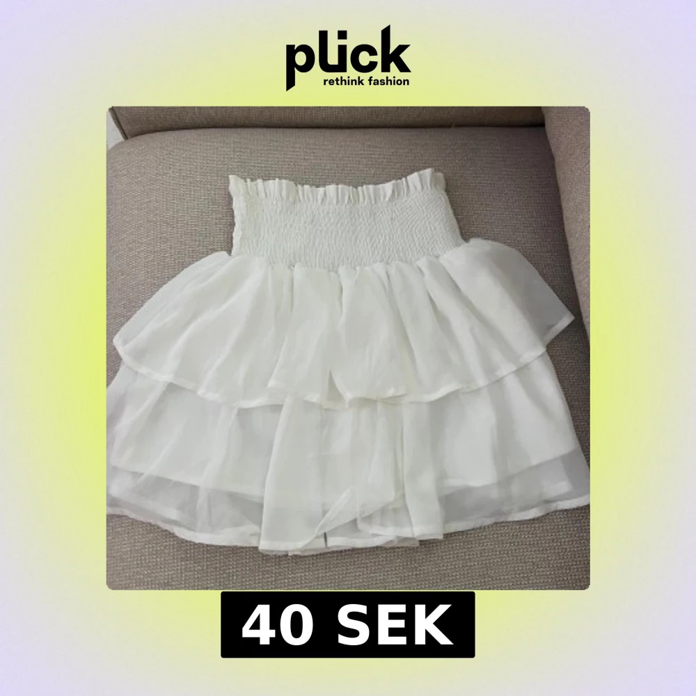 Supersöt vit kortkjol med bred smockresår i midjan och dubbla lager volanger. Kjolen är luftig och lätt, perfekt för varma dagar. Materialet känns som tunn polyester eller liknande, vilket ger ett flowy och romantiskt intryck.
