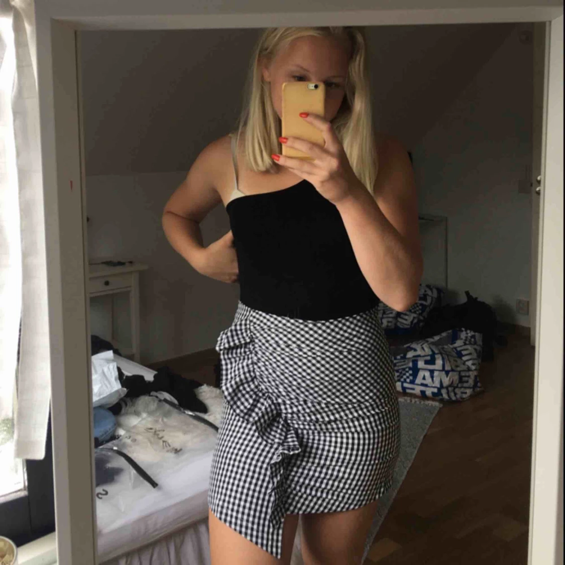 Galet snygg kjol från Shein.com som tyvärr sitter lite för tajt för mig, därför är den aldrig använd bara provad. Storleken är M men enligt mig både S/M. Fin volang igenom framsidan och kjolen har en dragkedja baktill. Fraktar helst!