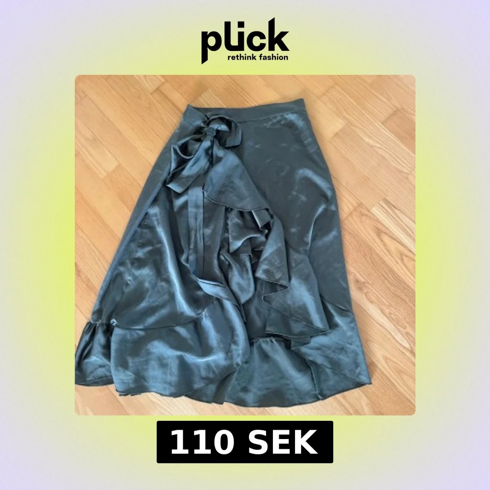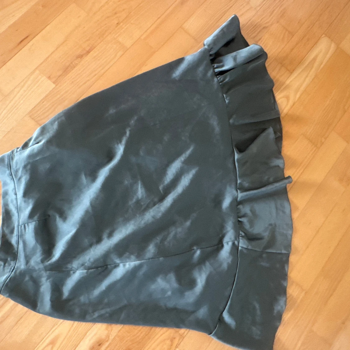Säljer en snygg grön omlottkjol i satinliknande material. Kjolen har volangdetaljer längs kanten och knyts i midjan med en rosett. Perfekt för dig som vill ha en trendig och elegant look.