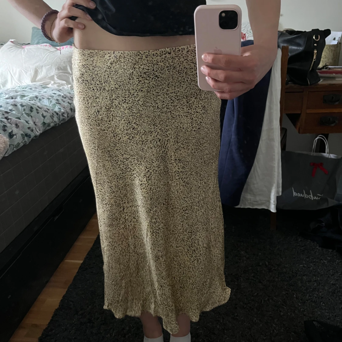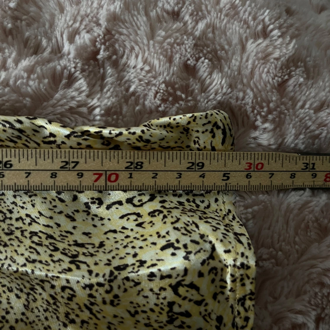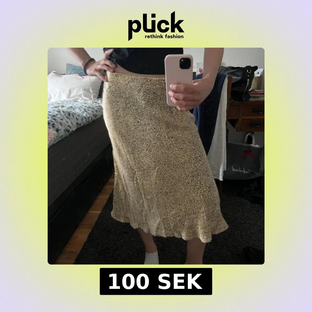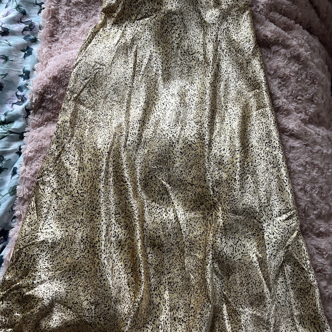 Guldig, glansig kjol i silkeslent material. Jattefick skick, aldrig anvand. Sma leoparddetaljer, supersot nar man ska va lite extra fin. 35 cm rakt över, men en stretchig resár i midjan! Hör av dig vid frägor.