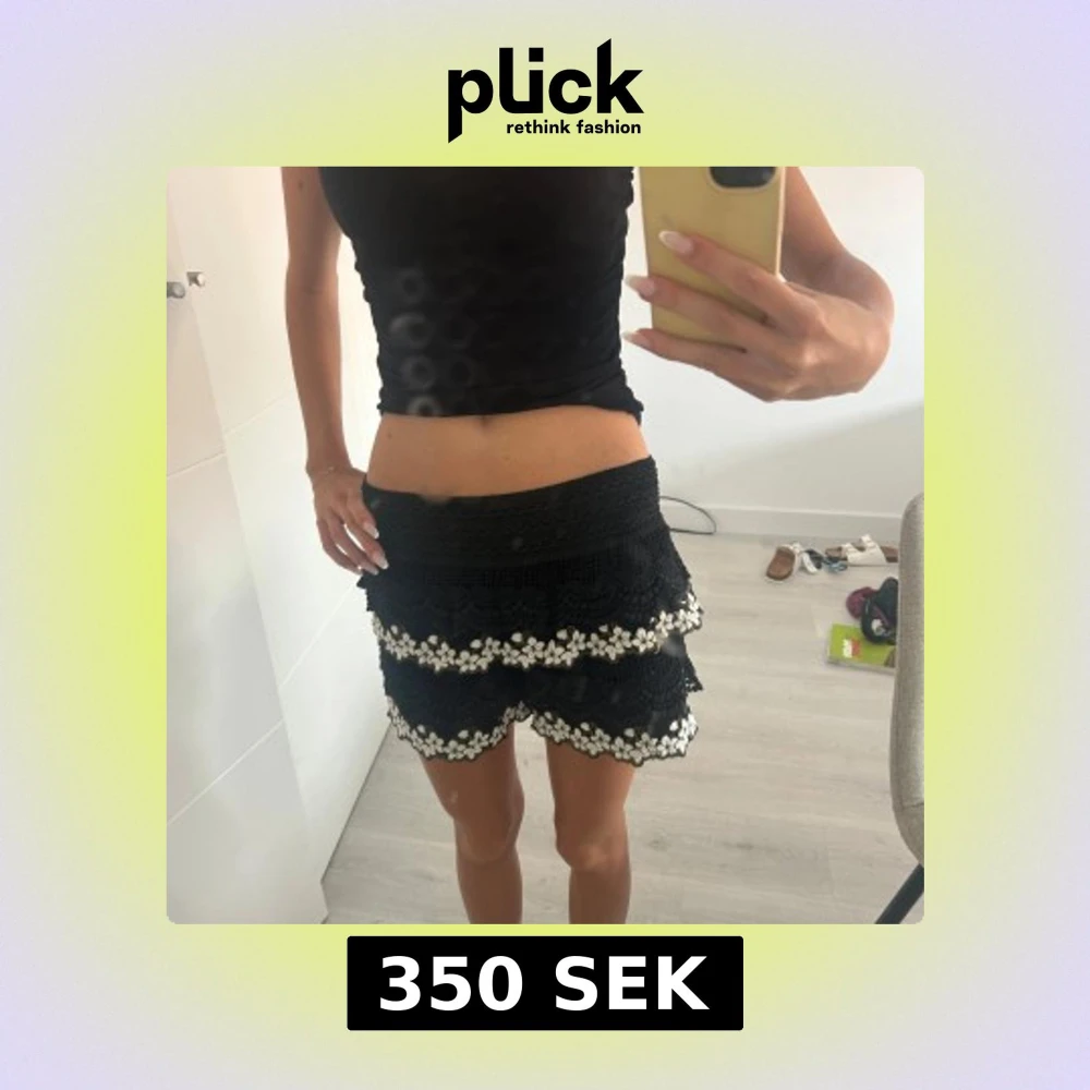 Supersöt svart spetsshorts med volanger och vita broderade blommor. Kjolen är i spets och har en bred midja som sitter skönt.