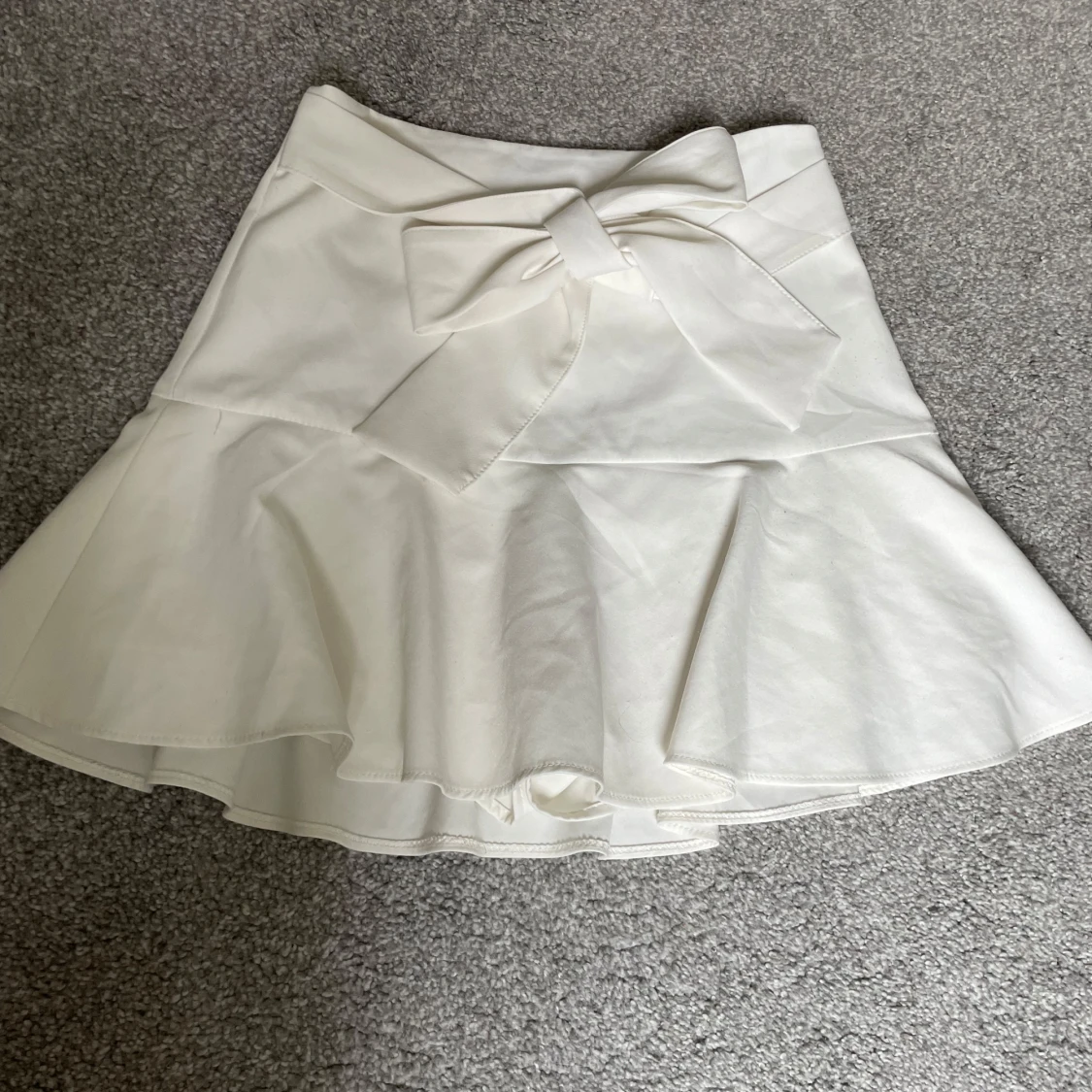 Supersöt vit kjol med volang och rosett framtill från zara. Kjolen har en kort längd och en lätt utsvängd form med inbyggda shorts. Perfekt till sommaren🌸🌸