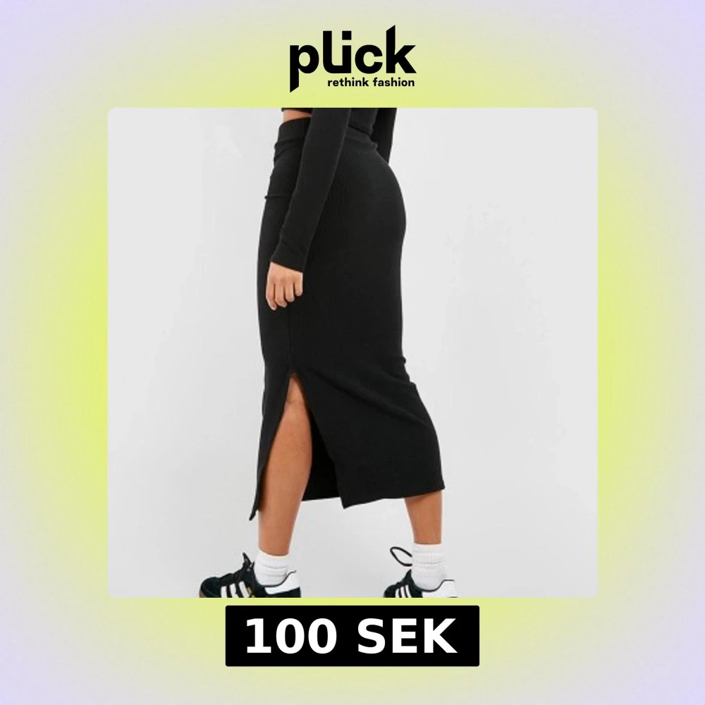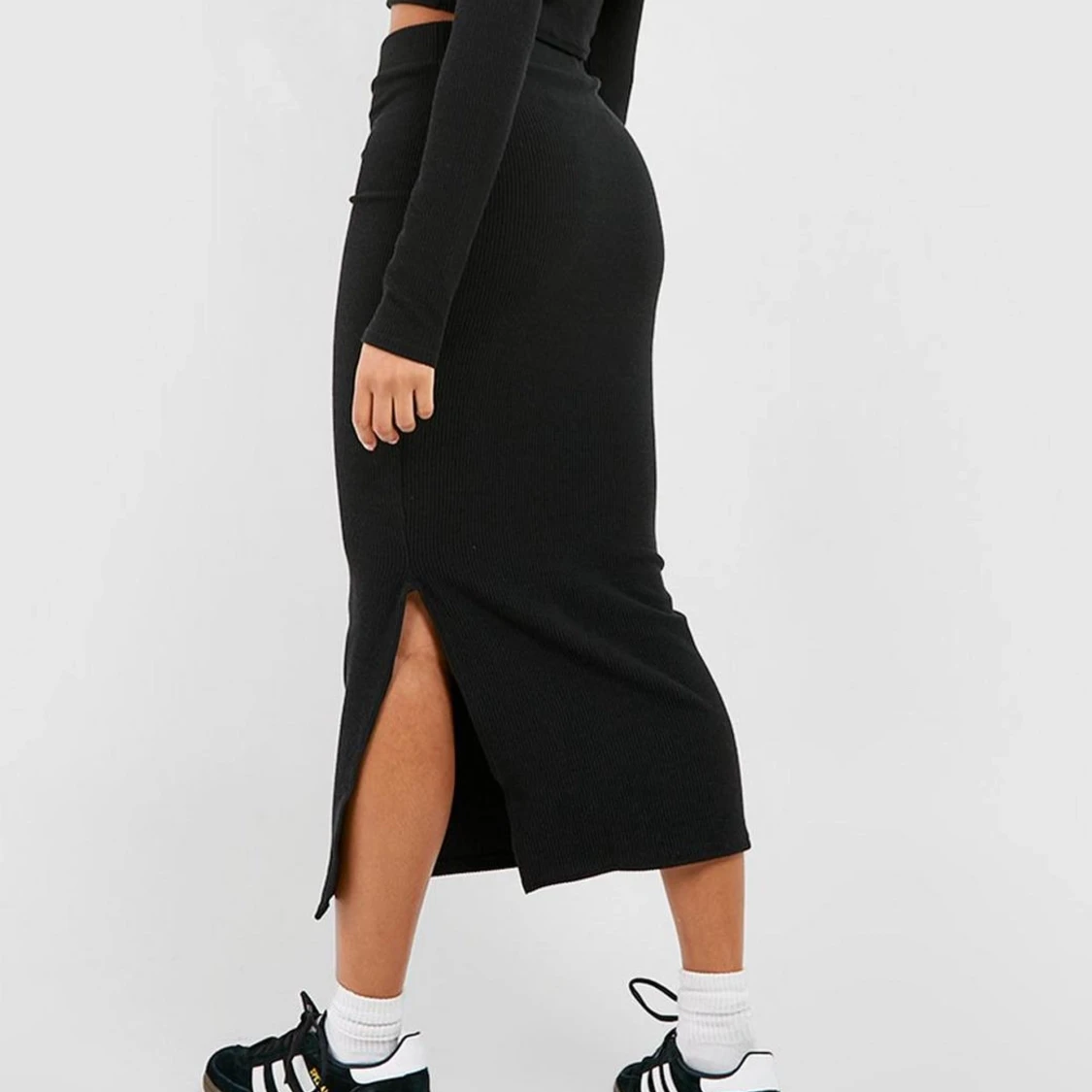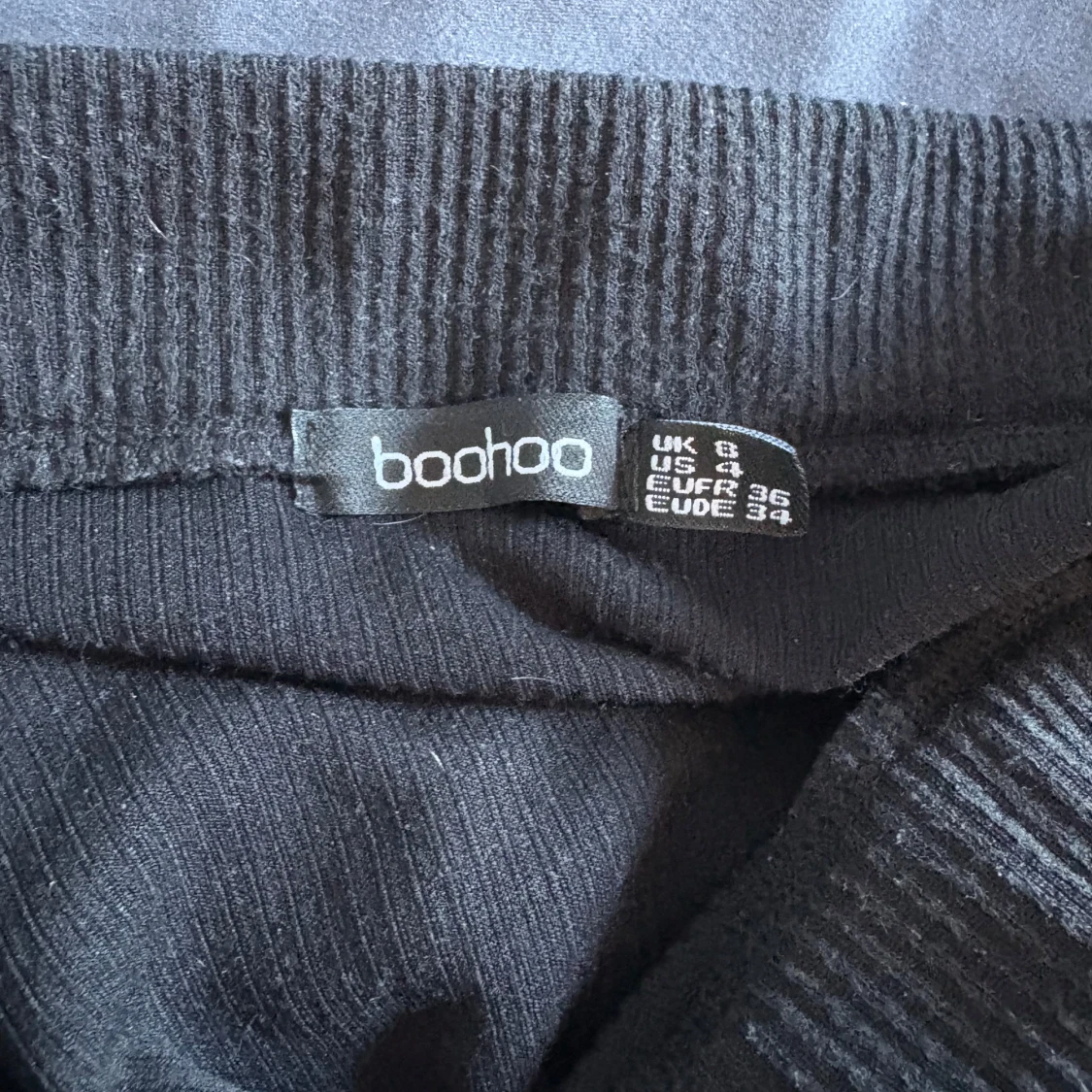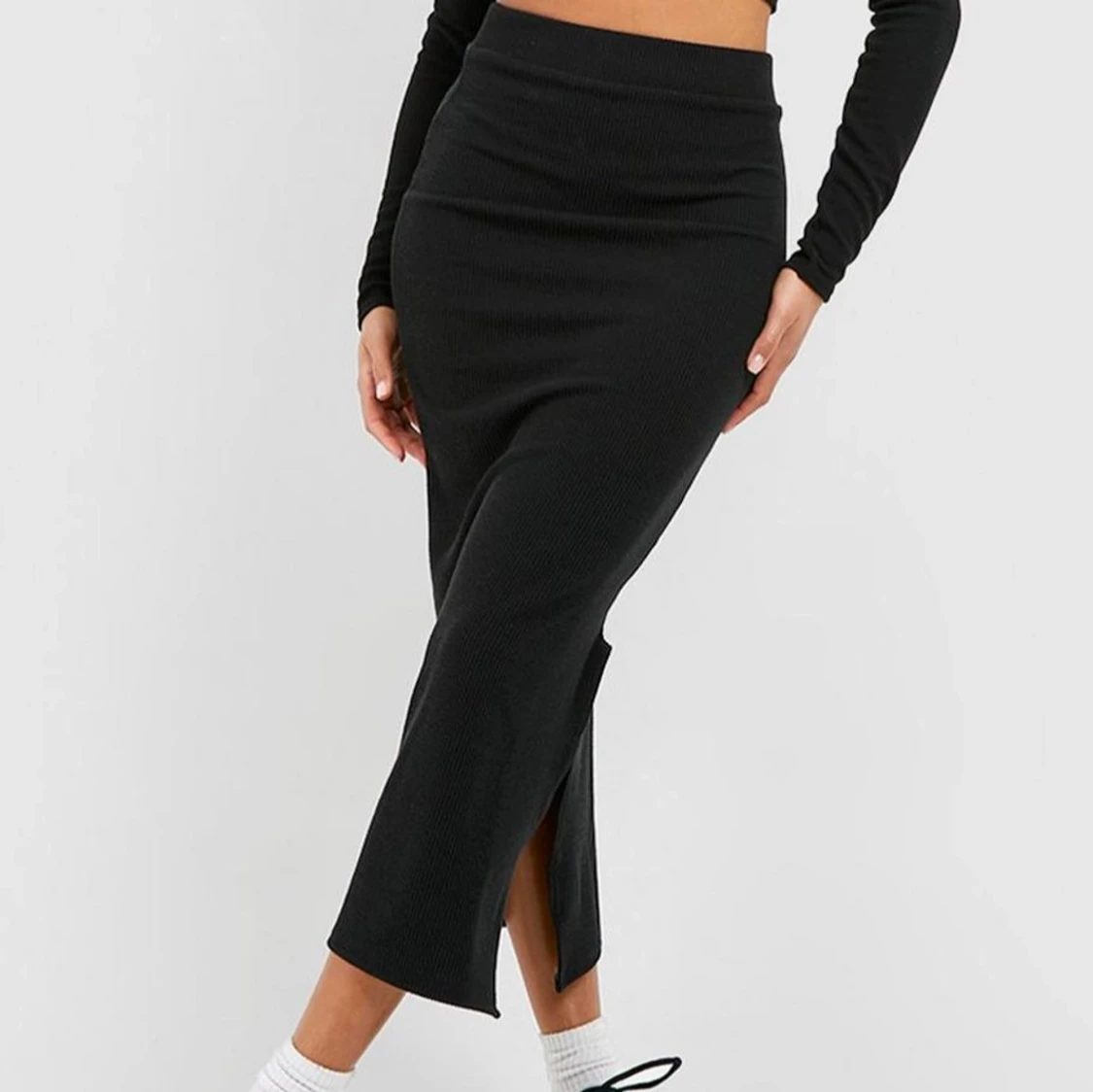 Snygg svart ribbad kjol från Boohoo med en stilren slits på sidan. Kjolen har en tight passform. Den är gjord i ett mjukt och stretchigt material. Använd fåtal gånger.