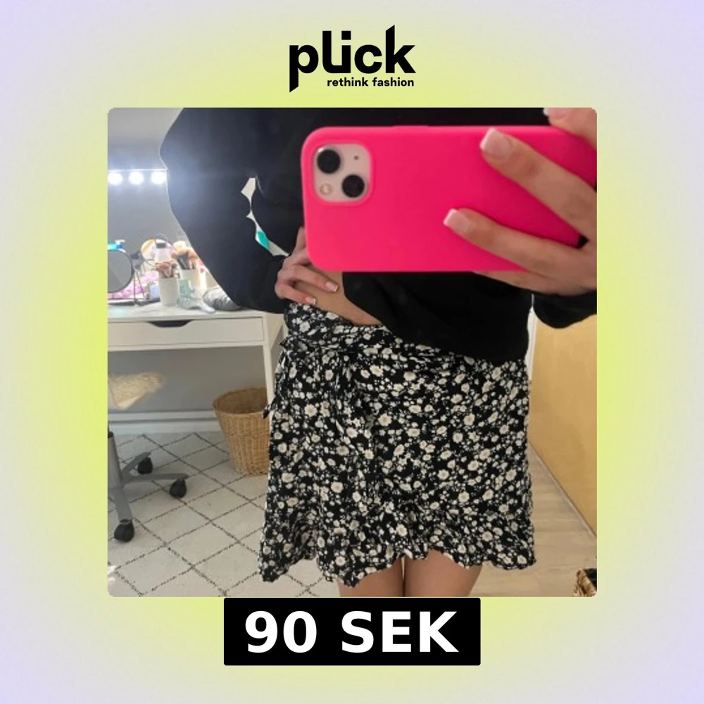 Säljer en svart omlottkjol med vitt och gult blommönster. Kjolen har volangdetalj längs nederkanten och knyts i sidan. Perfekt för dig som gillar en feminin och trendig stil.