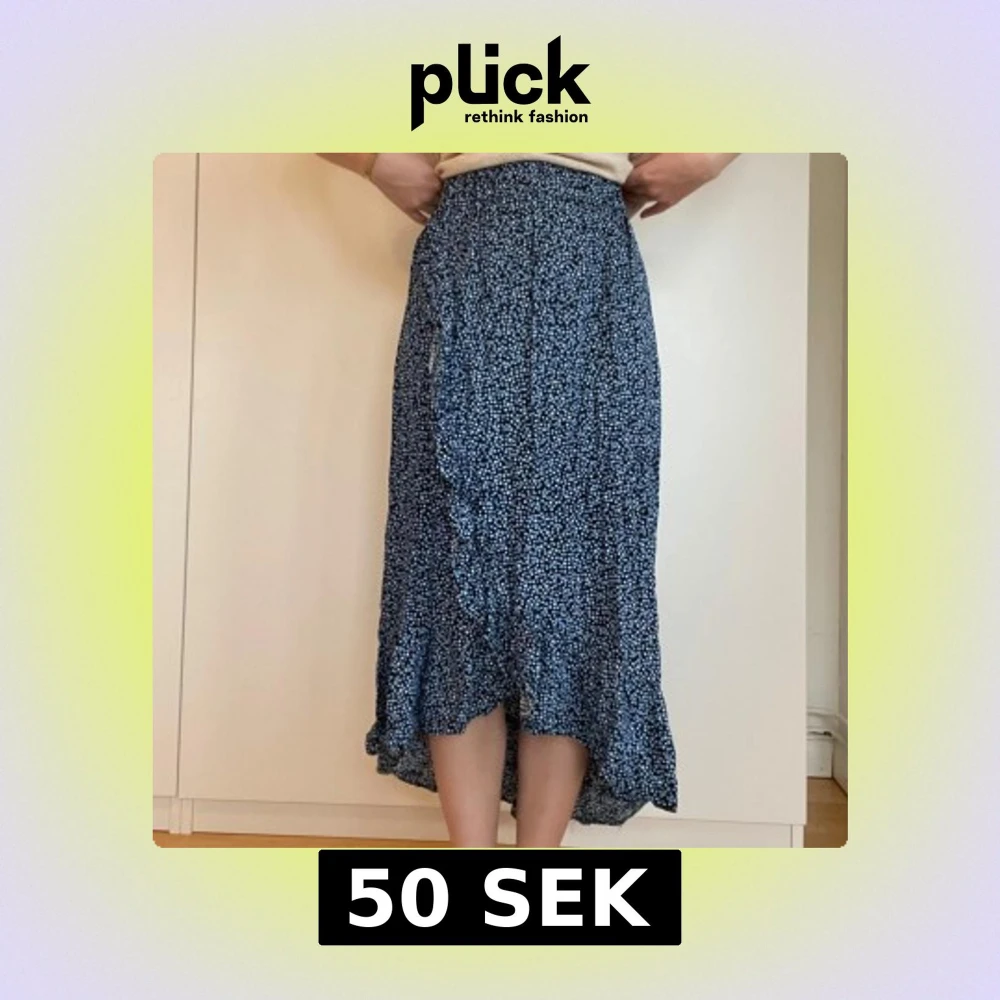 Flowig långkjol i svart med blå och vita prickar, omlottmodell med volangkant framtill. Kjolen har en lätt och luftig känsla, perfekt för varmare dagar. Snyggt fall och midilängd som ger en chill vibe.