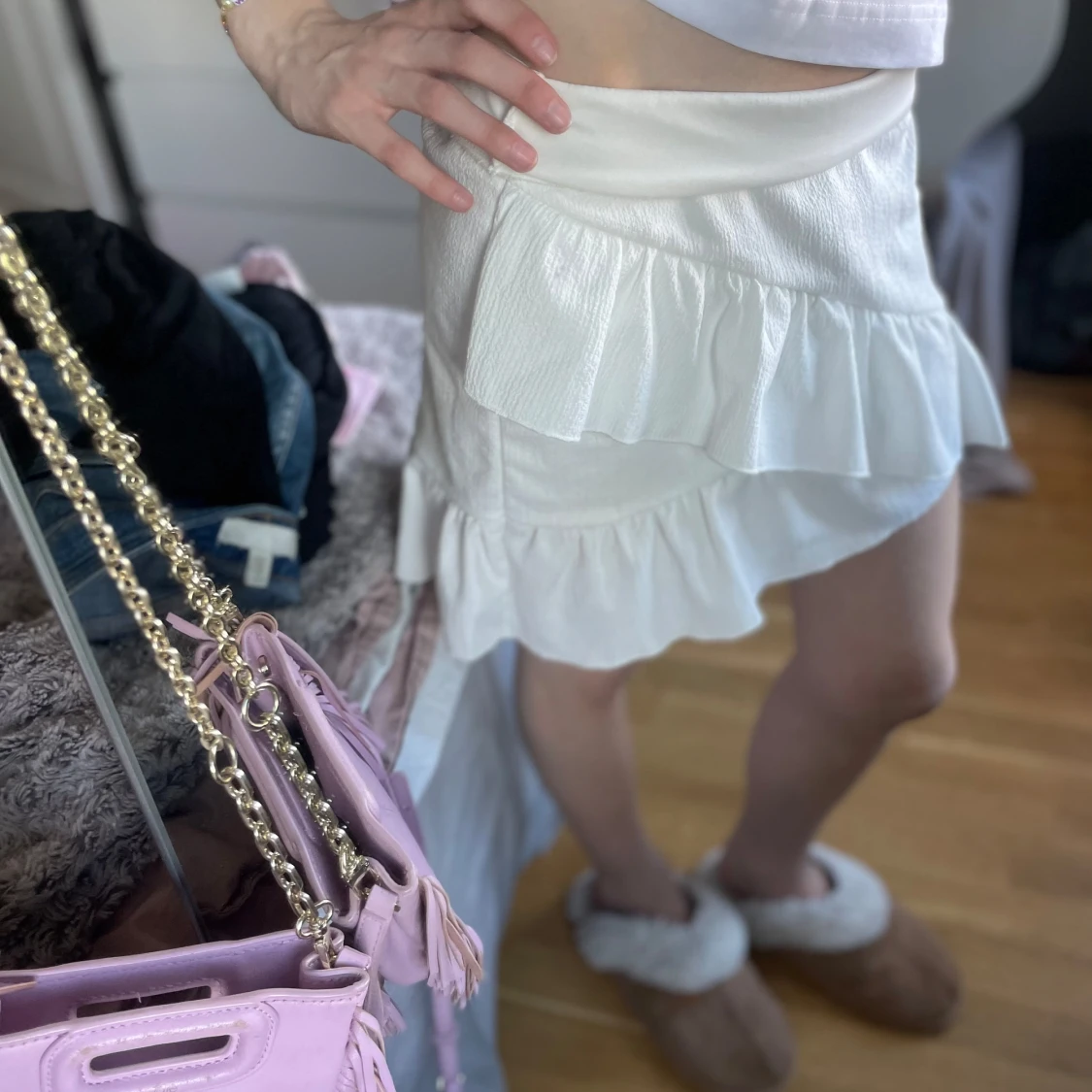 Superfin vit kjol med volangdetaljer och kort längd. Kjolen har en lätt struktur i tyget och sitter normalt i midjan. Perfekt för en fräsch och somrig look.