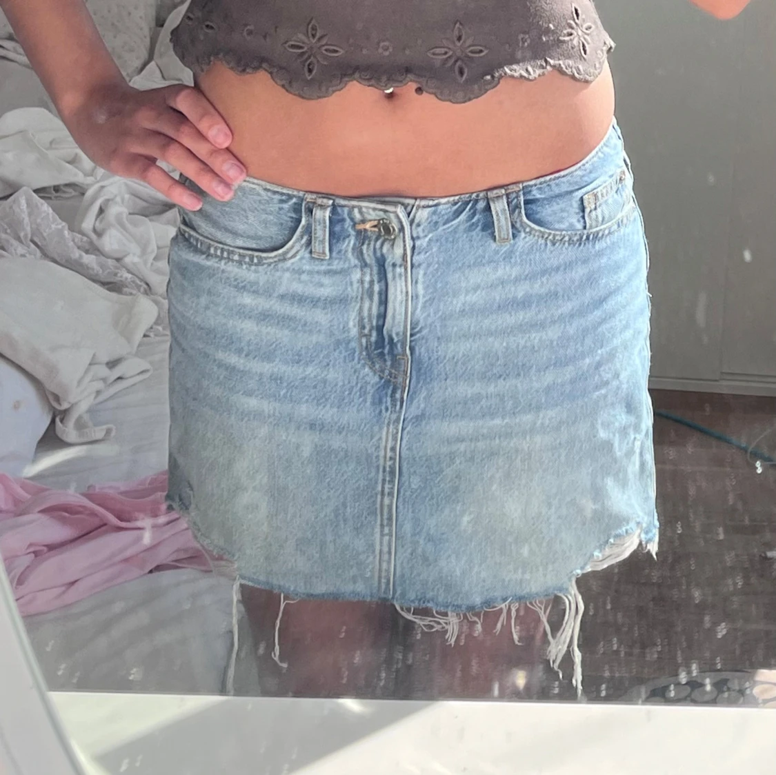 Säljer en ljusblå jeanskjol med fransig nederkant och klassiska fickor både fram och bak. Kjolen har en kort passform och stängs med dragkedja och knapp framtill. Perfekt för sommaren.