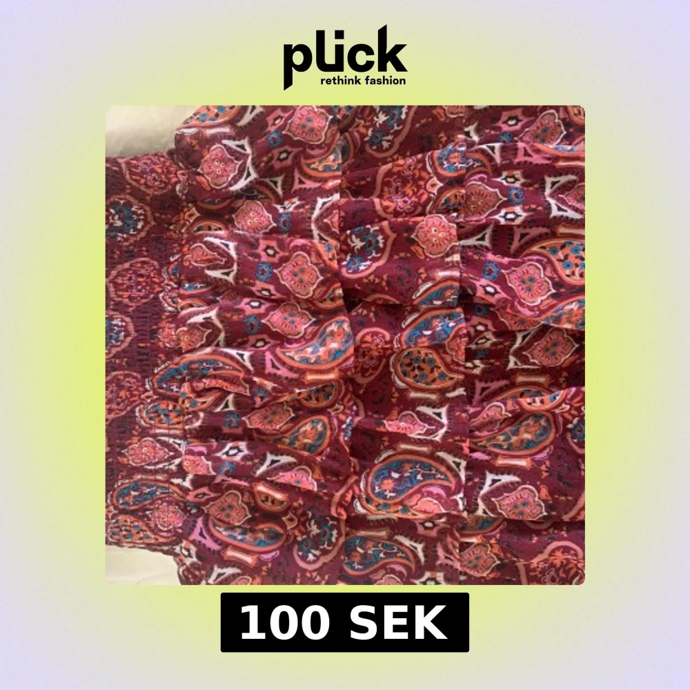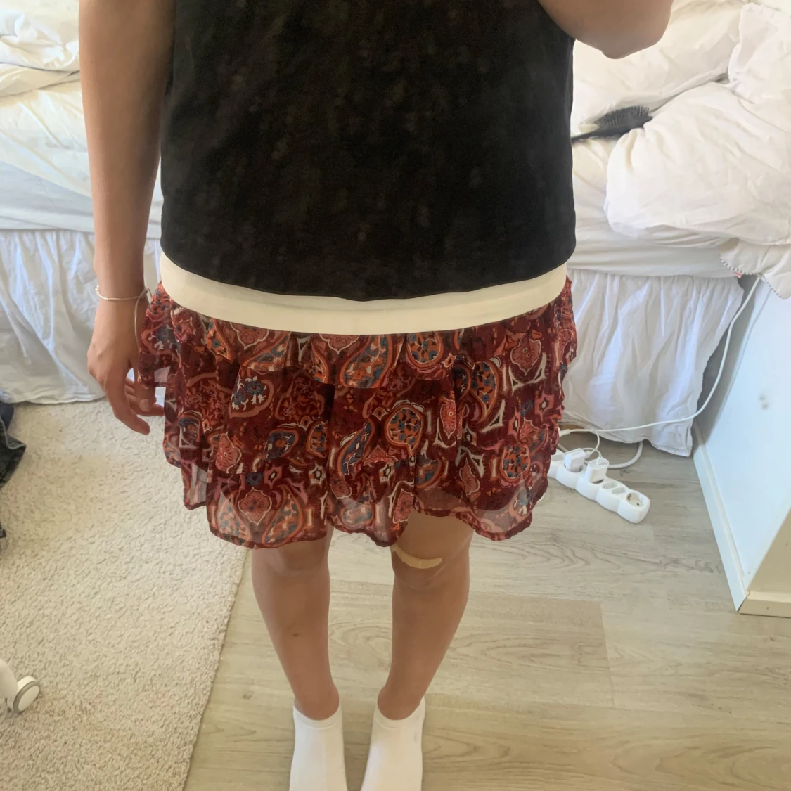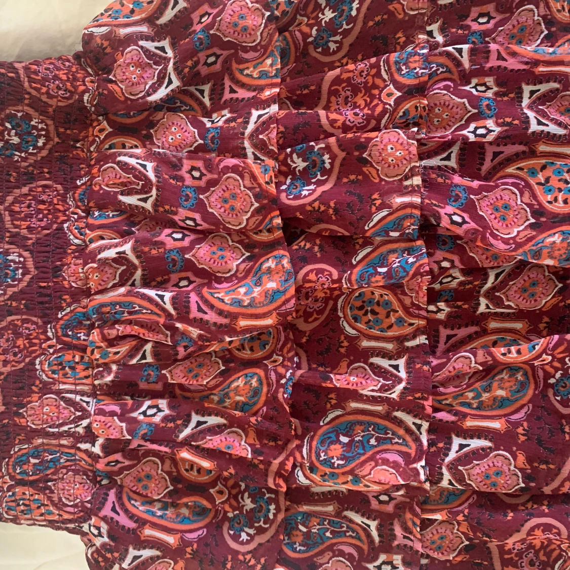 Säljer en kortkjol med volang och smock i midjan. Kjolen har ett färgstarkt paisleymönster i vinrött, rosa, blått och orange. Perfekt för dig som gillar boho-stil och vill ha något färgglatt i garderoben.