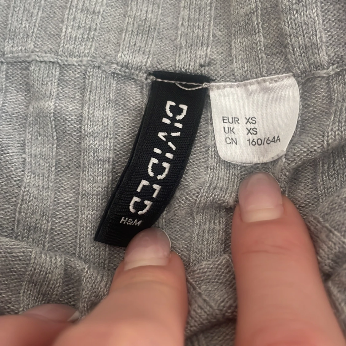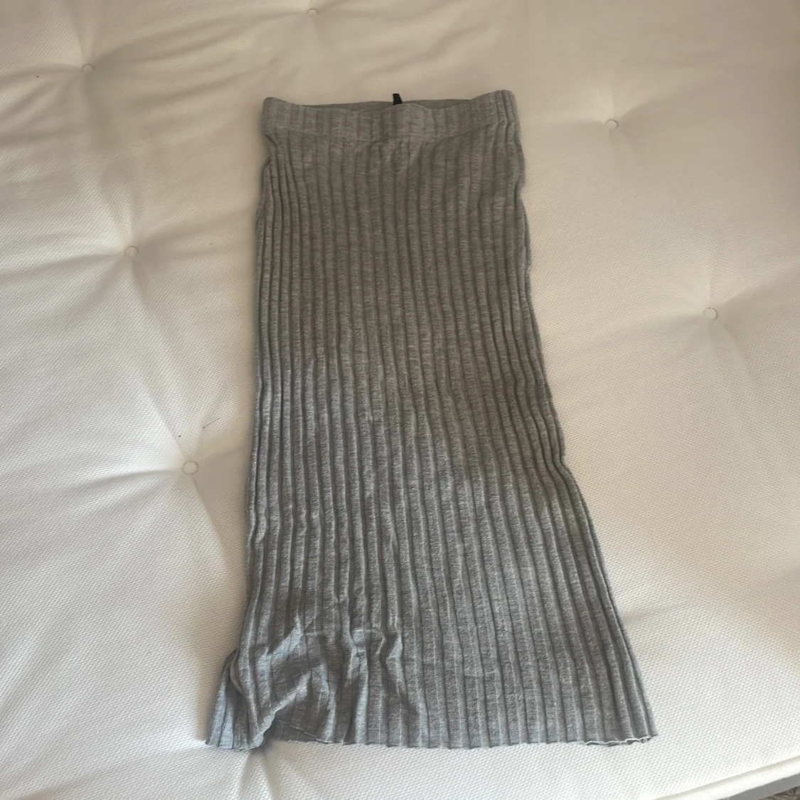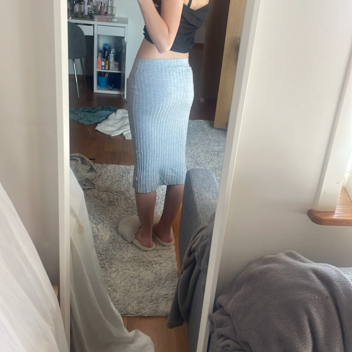 Säljer en grå, ribbad midilång kjol från H&M Divided i storlek XS. Kjolen är figurnära och har en stretchig känsla som sitter snyggt på kroppen. Perfekt att styla med en crop top eller hoodie för en chill look. Lite nopprig men inget man tänker på