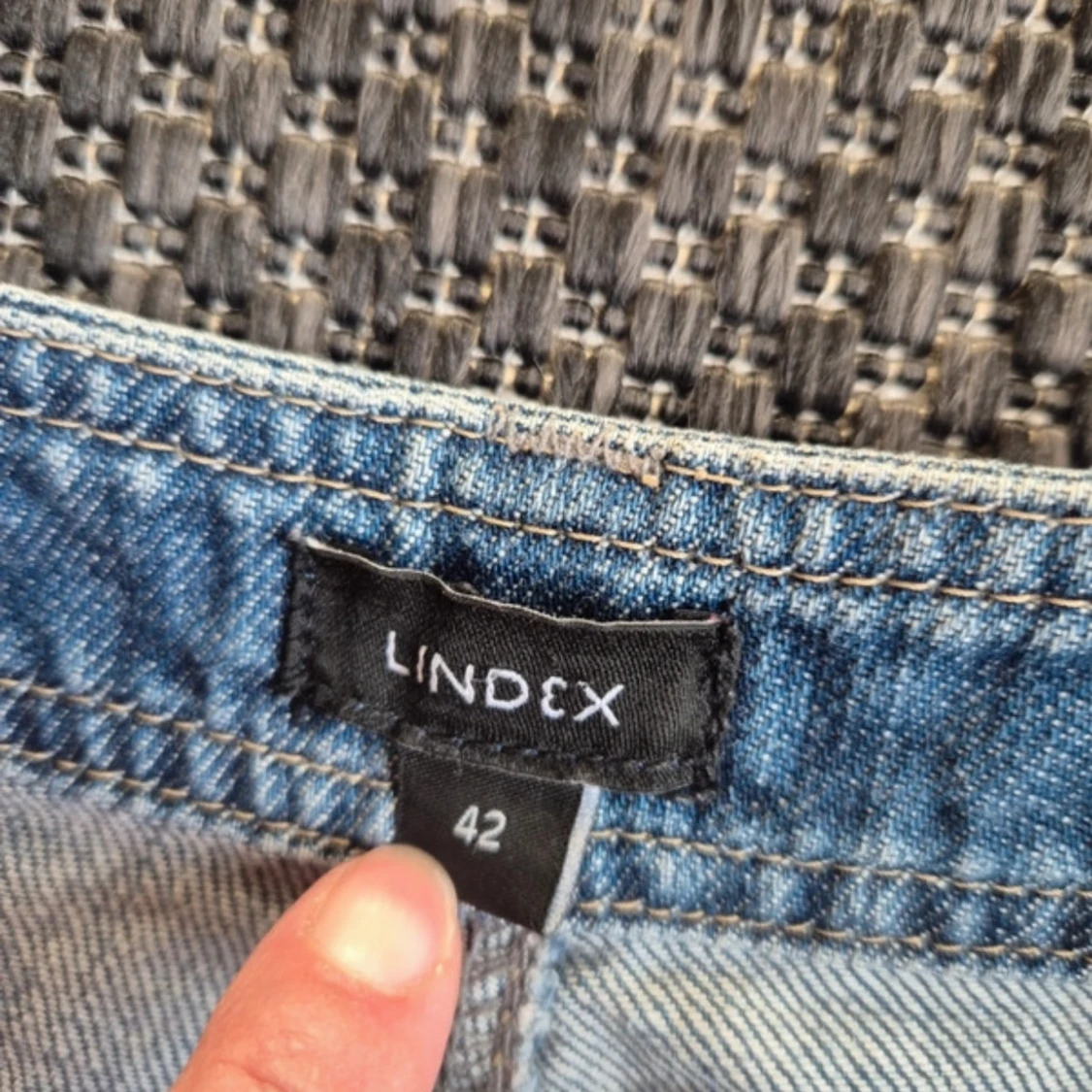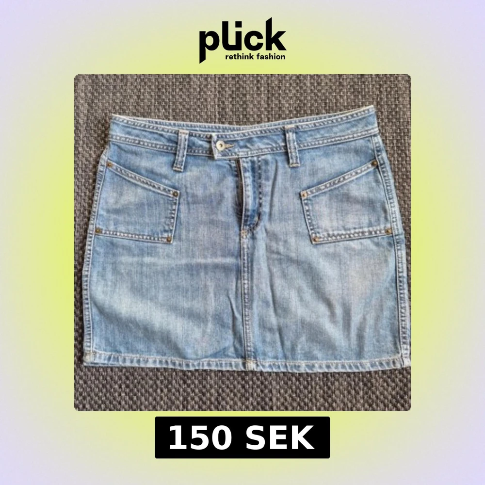 Snygg ljusblå jeanskjol från Lindex med klassisk femficksdesign, bälteshällor och knappstängning framtill. Midjemått - ca 44 cm, Längd - ca 40 cm