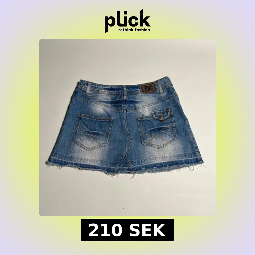 Midja=37,5. Längd=33 cm. Snygg blå jeanskjol med slitningar och fransig kant. Kjolen har en klassisk femficksdesign och en knapp framtill. Perfekt för en avslappnad stil.