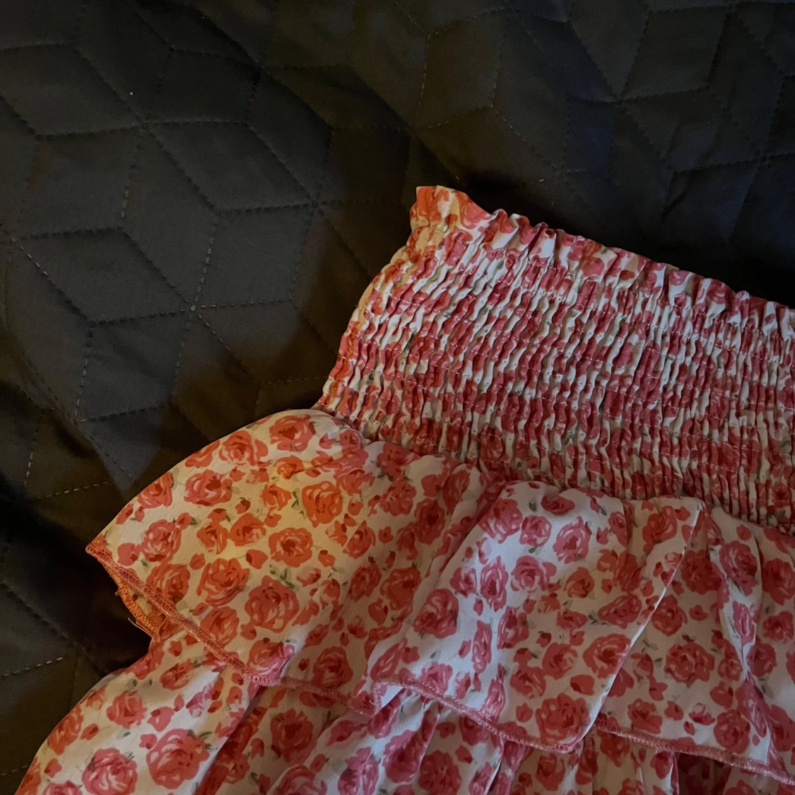 Söt blommig volangkjol från Shein i rosa och vit. Kjolen har flera lager volanger och en elastisk midja för bekväm passform. Perfekt för en somrig look!