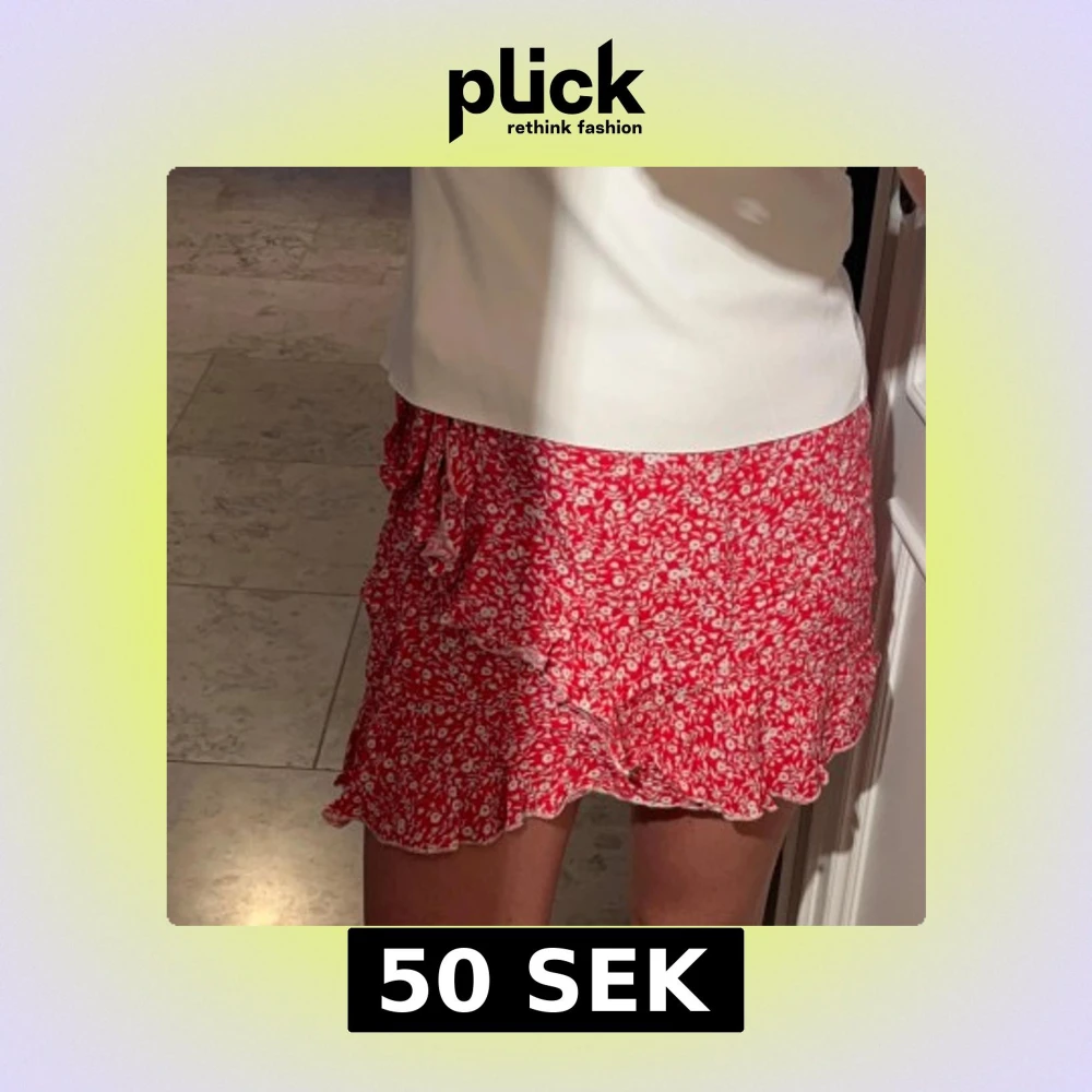 Superfin röd kortkjol med vita blommor och volangkant. Kjolen har omlottmodell och knyt i sidan, vilket ger en söt och somrig vibe. Perfekt för varma dagar och lätt att matcha med en enkel topp.