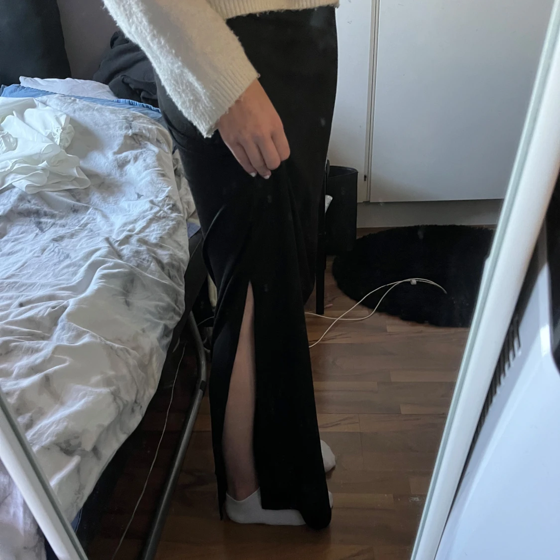 Säljer en superfin svart långkjol ifrån shein som har en slits på sidan, använd ett par gånger, har lite defekter men inget man tänker på (sista bilden) 💕