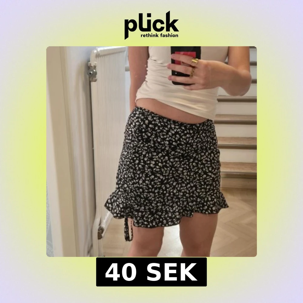 Supersöt svart kjol med vita blommor från SKUE. Volangkant och snörning på sidan. Säljer då den inte kommer till användning! Knappt använd. Stl s, 36