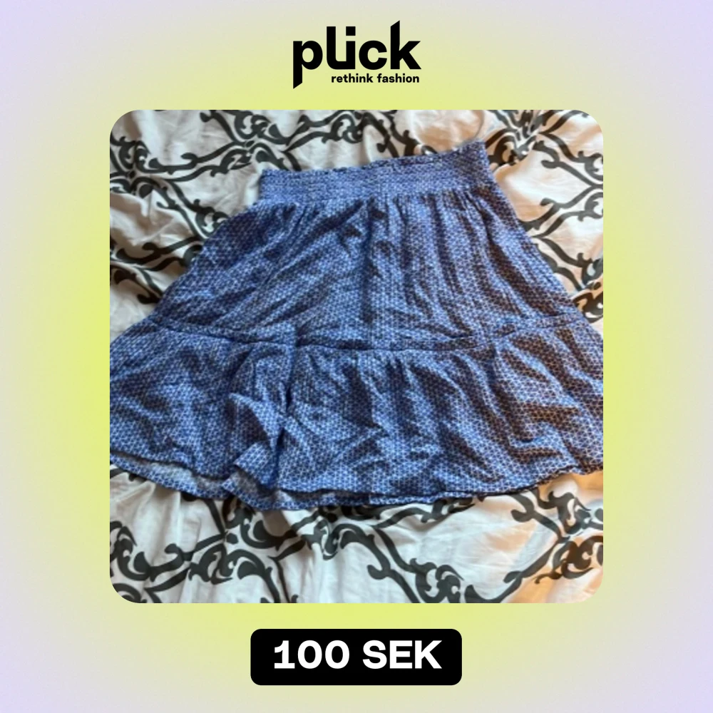 En blå kortkjol med ett subtilt mönster. Kjolen har en elastisk midja och volangdetaljer.