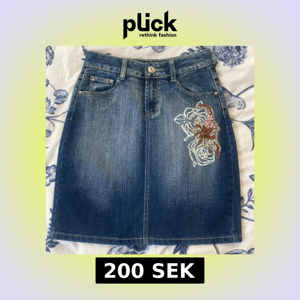 Säljer en blå jeanskjol med snygg broderad blomma och strassdetaljer framtill samt en vit ros på bakfickan. Kjolen har klassisk femficksdesign, knapp och dragkedja framtill. Perfekt för dig som vill sticka ut lite extra!
